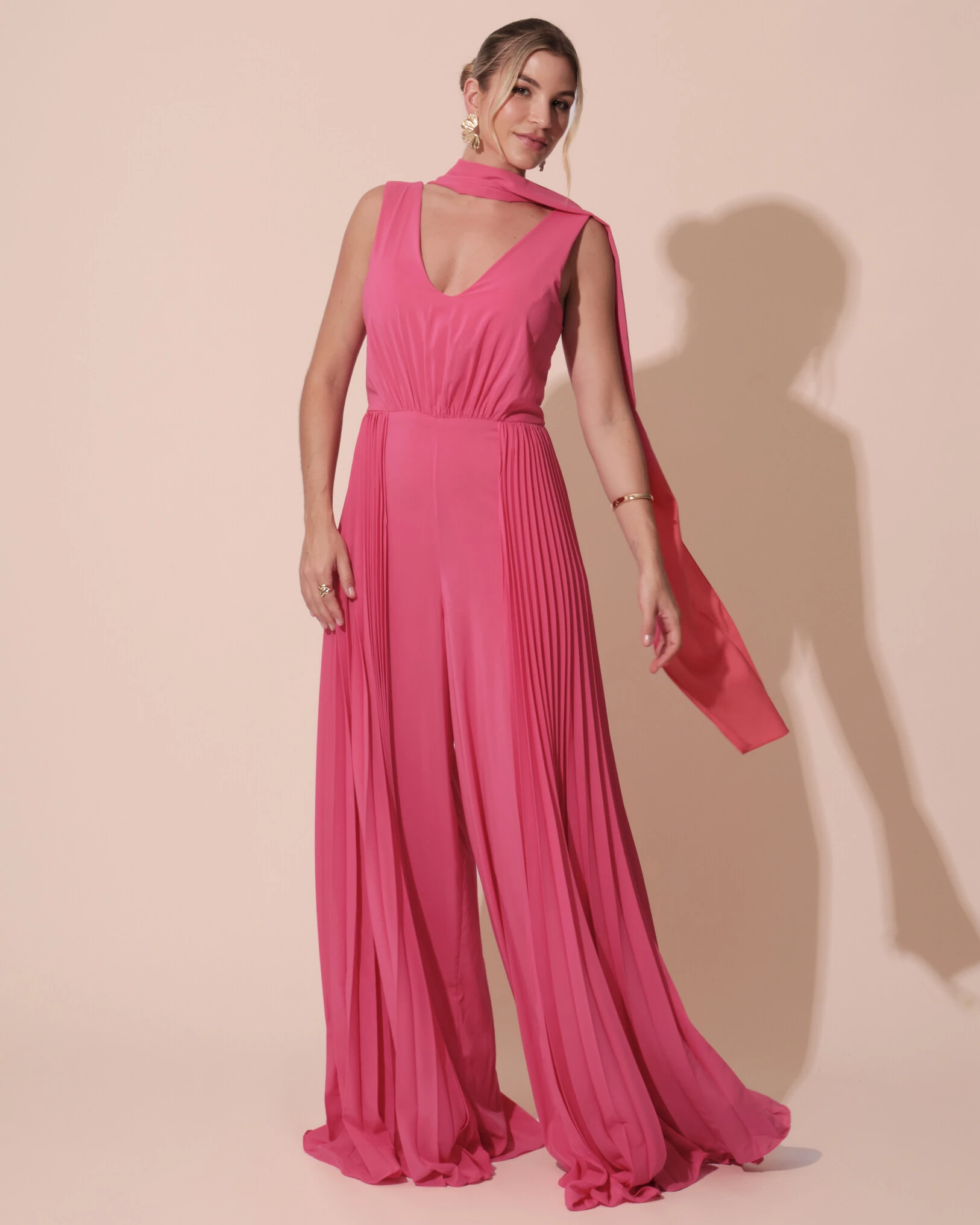 MACACÃO DE FESTA LONGO CREPE PLISSADO E LENÇO - Macacão longo com design elegante e fluido, confeccionado no crepe perfeito para quem busca sofisticação com leveza. O modelo possui decote em V na frente e nas costas, valorizando o colo e alongando a silhueta. A cintura marcada com leve franzido proporciona ajuste delicado ao corpo, destacando a feminilidade de forma sutil. A sobreposição plissada nas laterais cria movimento e efeito de saia sobre a calça, garantindo imponência e fluidez ao caminhar. O detalhe em faixa alongada no decote adiciona charme extra e versatilidade ao styling. Ideal para casamentos, formaturas e eventos noturnos, é uma peça que une conforto e impacto visual em uma proposta moderna e refinada.