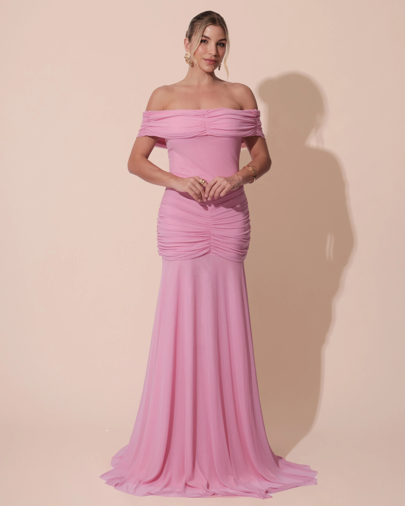VESTIDO DE FESTA LONGO TULE OMBRO A OMRO DRAPEADO COM SAIA FLUIDA - Esse vestido longo ombro a ombro é a escolha perfeita para quem busca elegância com um toque moderno e sensual na medida certa. O modelo valoriza a silhueta com o busto drapeado que destaca o colo, cintura marcada e saia com leve fluidez que alonga a silhueta, criando um visual sofisticado e impactante. Ideal para casamentos, formaturas, festas de gala e eventos noturnos, ele combina perfeitamente com sandálias de tiras finas ou salto metalizado, clutch estruturada e brincos longos ou pontos de luz para equilibrar o destaque do decote. Para um toque ainda mais glamouroso, aposte em um penteado preso ou semi-preso, deixando o colo em evidência e garantindo um look elegante e memorável.