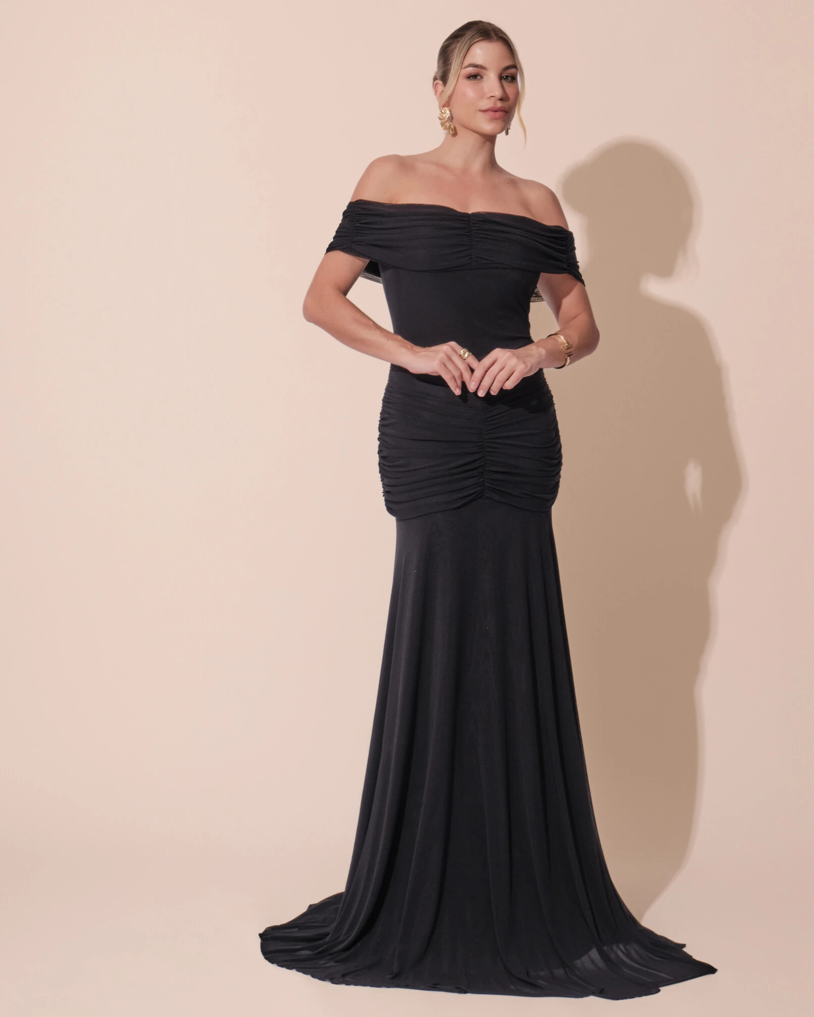 VESTIDO DE FESTA LONGO TULE OMBRO A OMRO DRAPEADO COM SAIA FLUIDA - Esse vestido longo ombro a ombro é a escolha perfeita para quem busca elegância com um toque moderno e sensual na medida certa. O modelo valoriza a silhueta com o busto drapeado que destaca o colo, cintura marcada e saia com leve fluidez que alonga a silhueta, criando um visual sofisticado e impactante. Ideal para casamentos, formaturas, festas de gala e eventos noturnos, ele combina perfeitamente com sandálias de tiras finas ou salto metalizado, clutch estruturada e brincos longos ou pontos de luz para equilibrar o destaque do decote. Para um toque ainda mais glamouroso, aposte em um penteado preso ou semi-preso, deixando o colo em evidência e garantindo um look elegante e memorável.