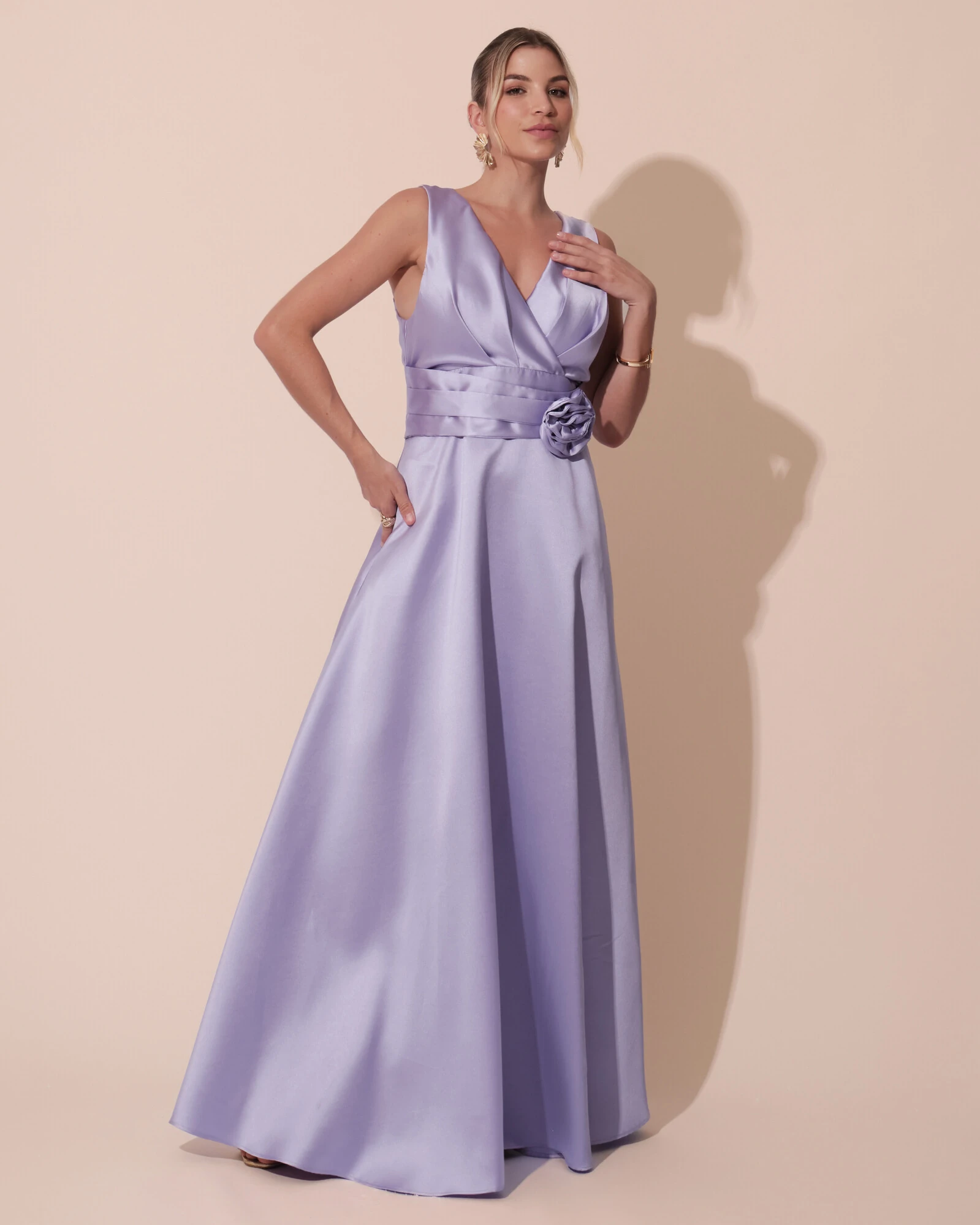 Vestido de Festa Longo Plus Size Zibeline Faixa e Flor Lilás