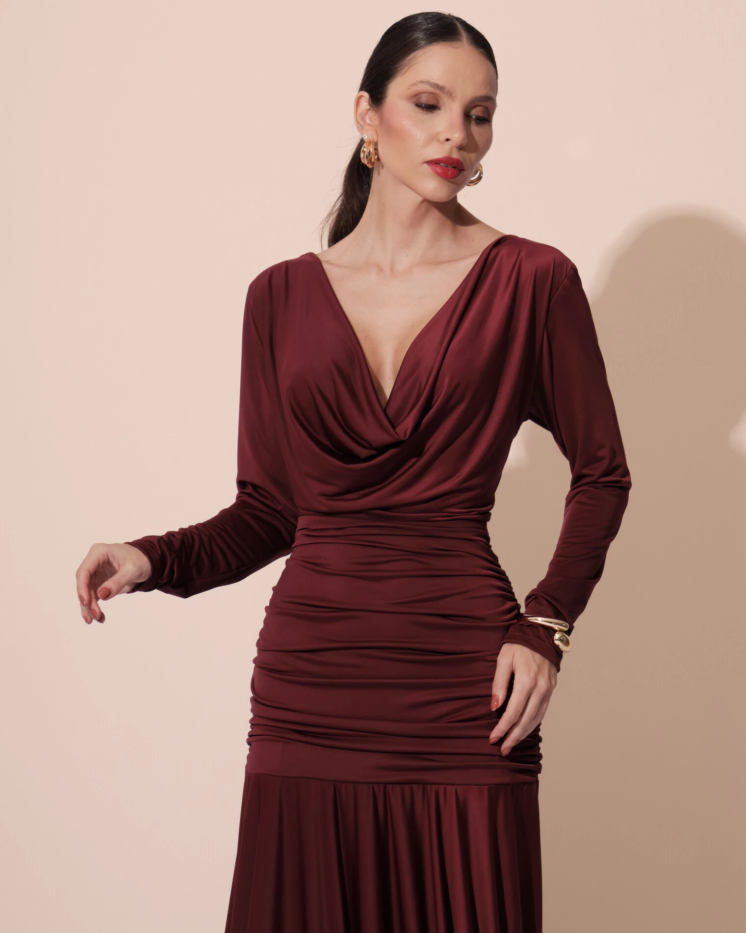 Vestido de Festa Longo Malha Degagê Drapeado Manga Longa Marsala Escuro
