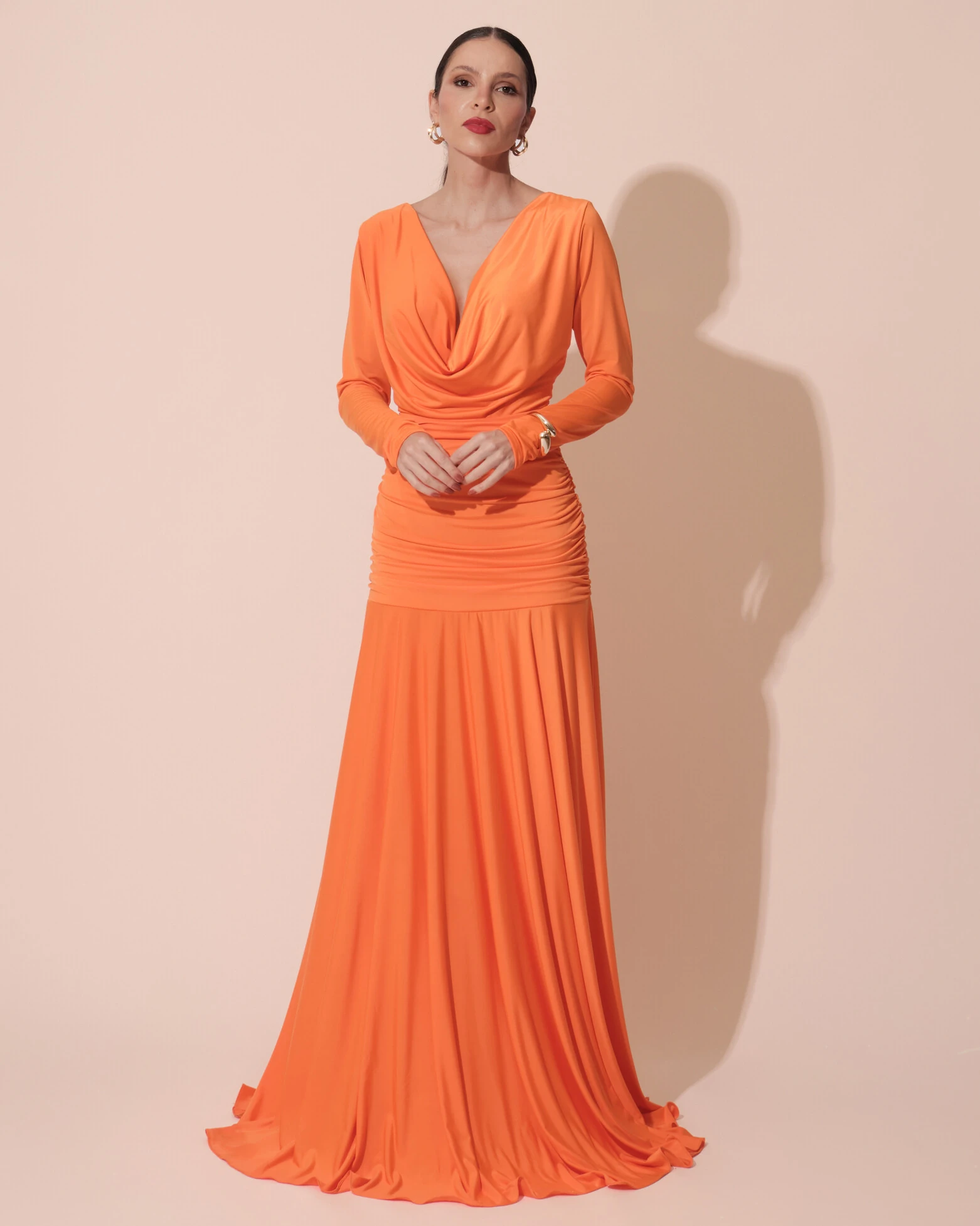 Vestido de Festa Longo Malha Degagê Drapeado Manga Longa Laranja