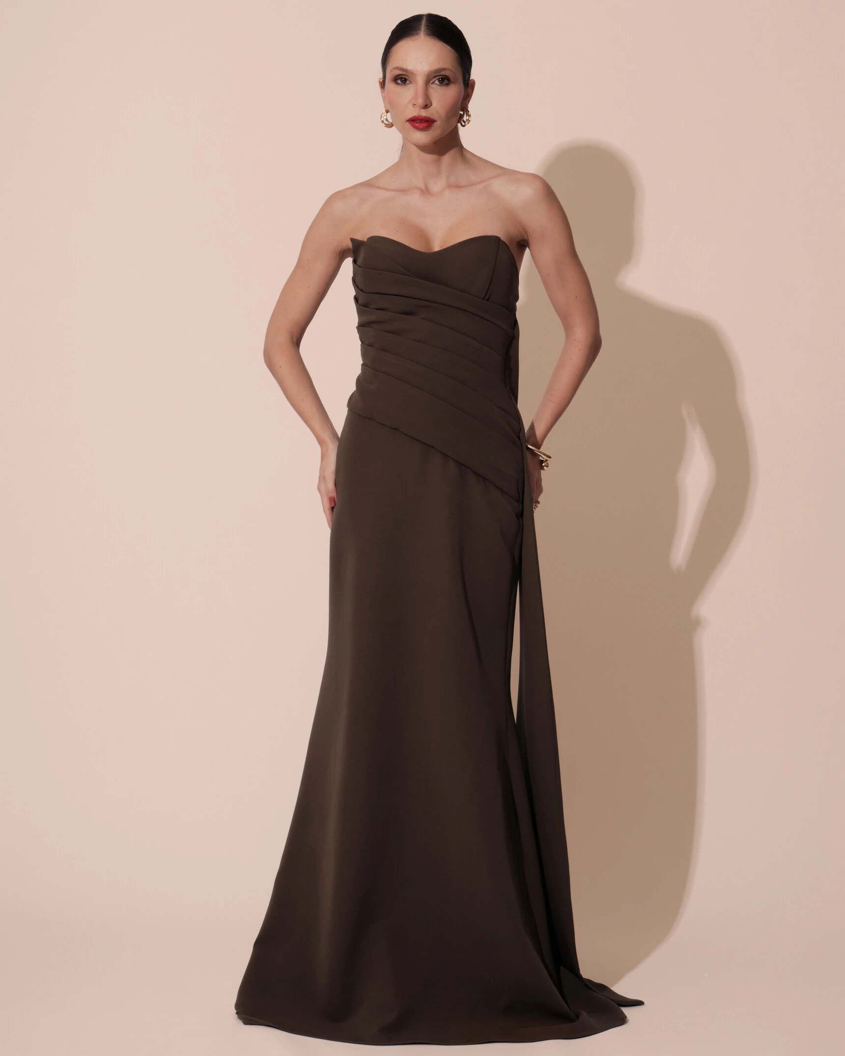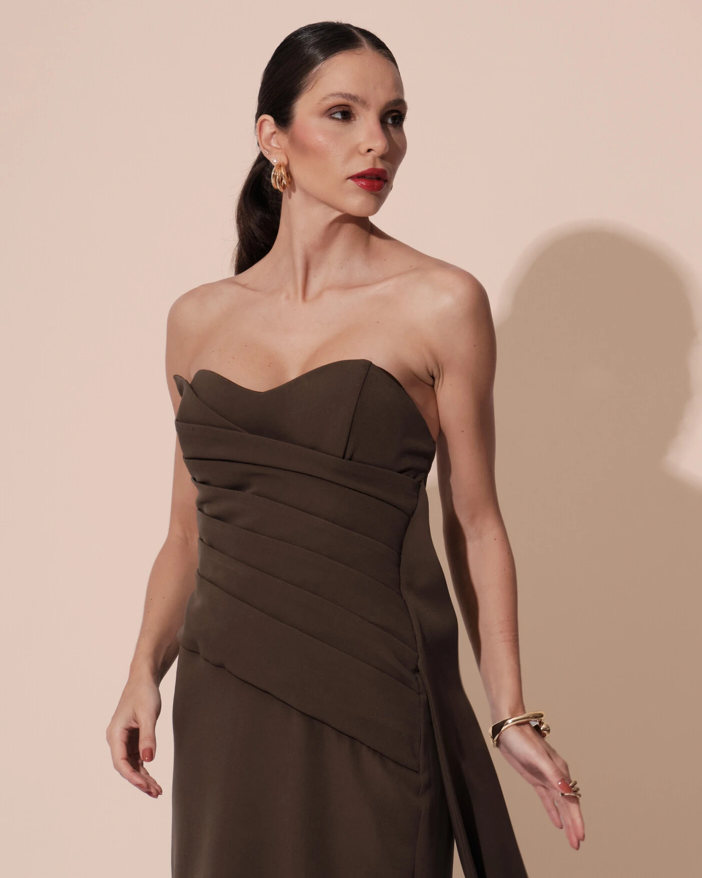 Confeccionado em alfaiataria, este vestido apresenta estrutura impecável que realça a silhueta, com busto tomara que caia modelado e drapeados estratégicos que adicionam elegância ao caimento; a peça conta ainda com um lenço integrado na cintura, que cria leve movimento e um detalhe moderno, enquanto a saia alongada mantém linhas limpas e sofisticadas típicas do acabamento alfaiatado.