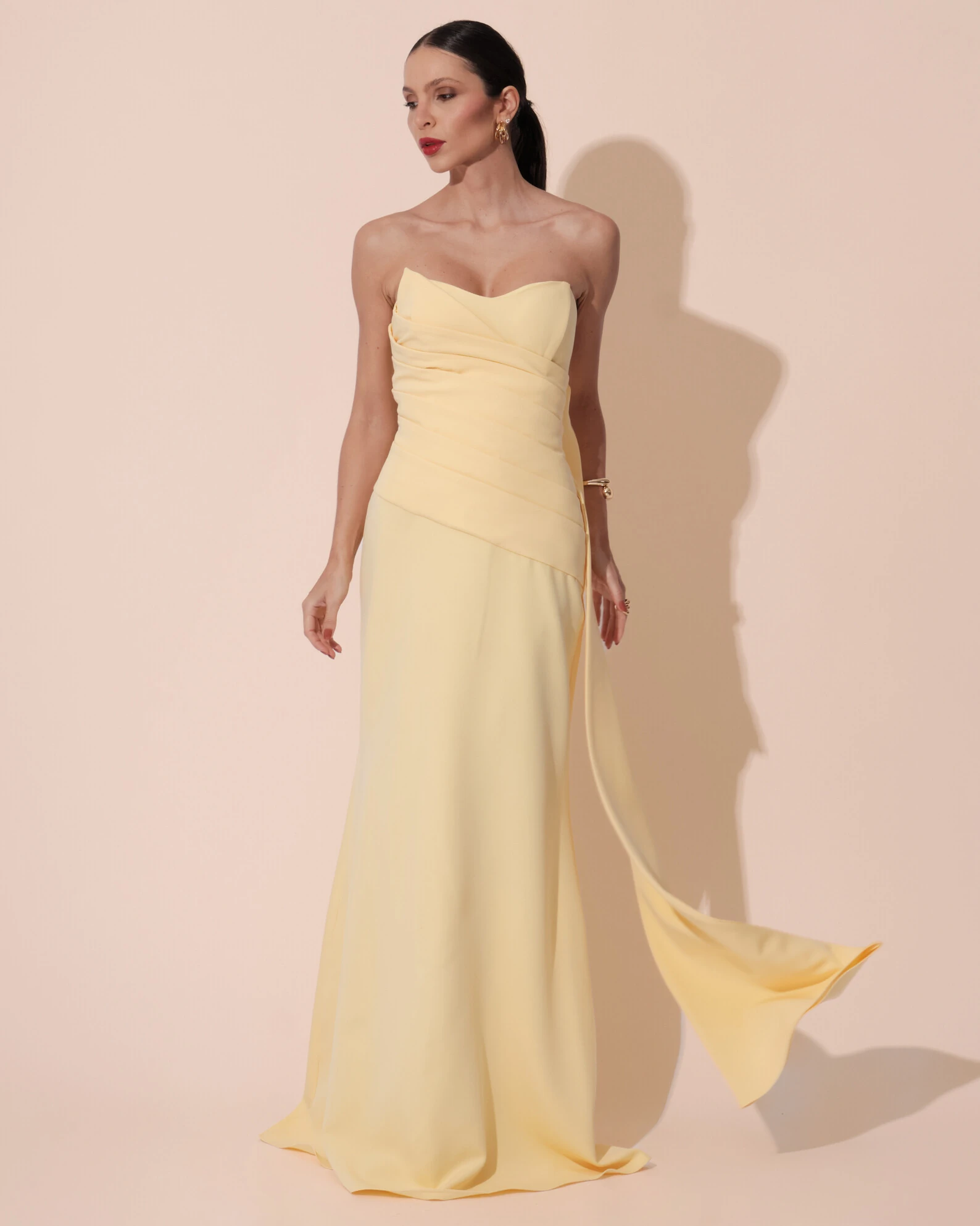 Vestido de Festa Longo Alfaiataria Tomara que Caia Drapeado Faixa Amarelo Manteiga