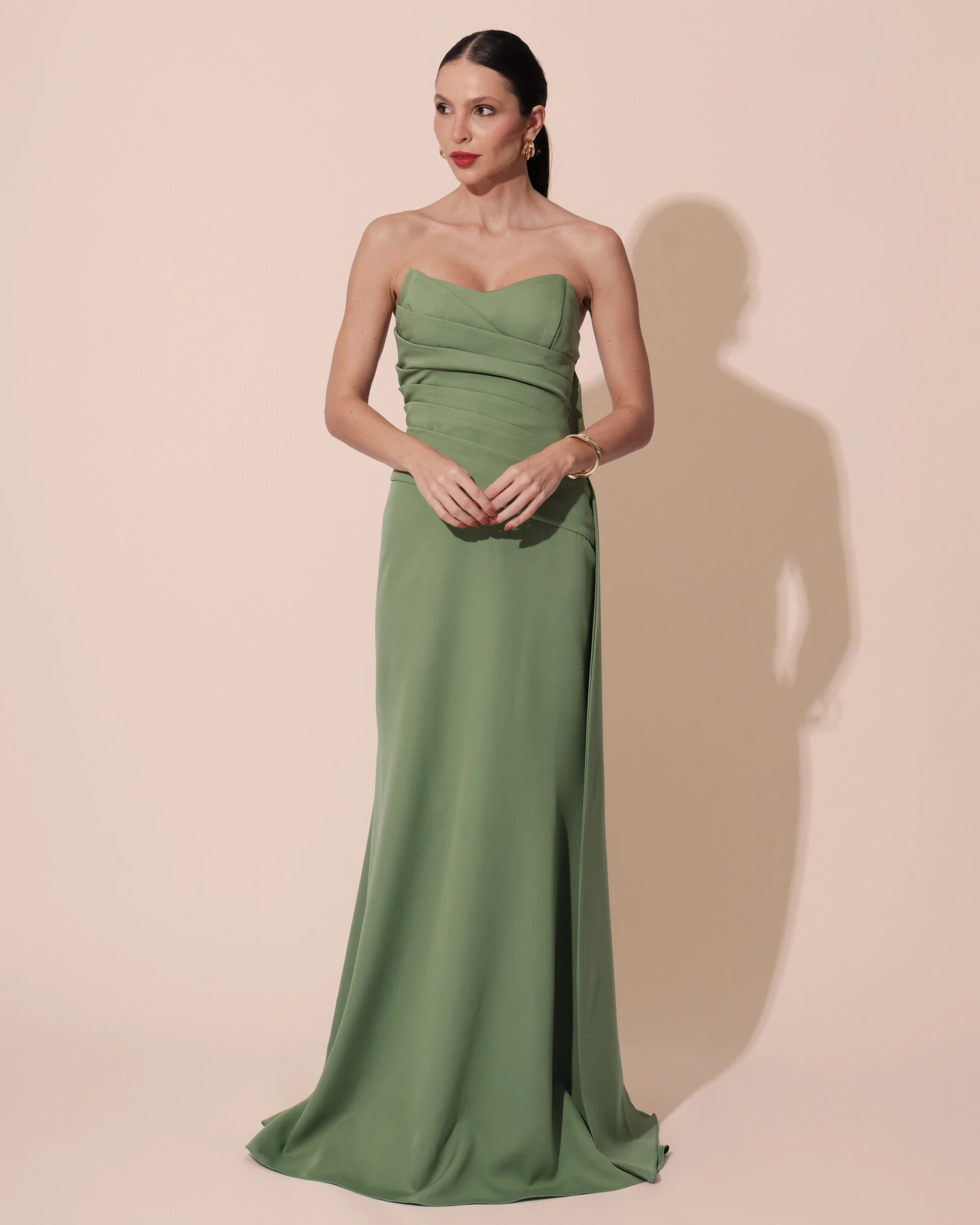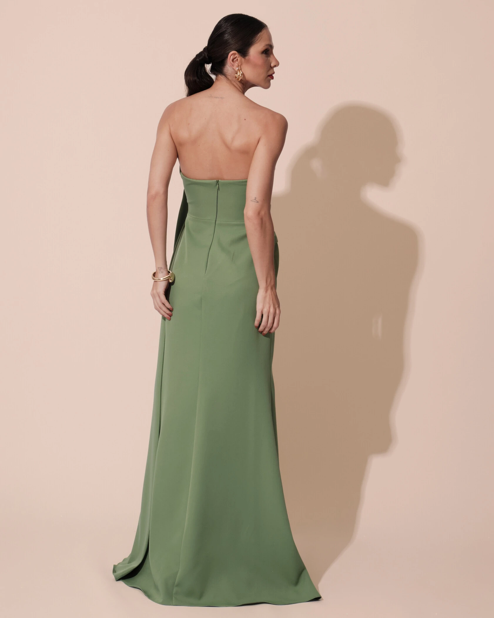 Vestido de Festa Longo Alfaiataria Tomara que Caia Drapeado Faixa Verde Matcha