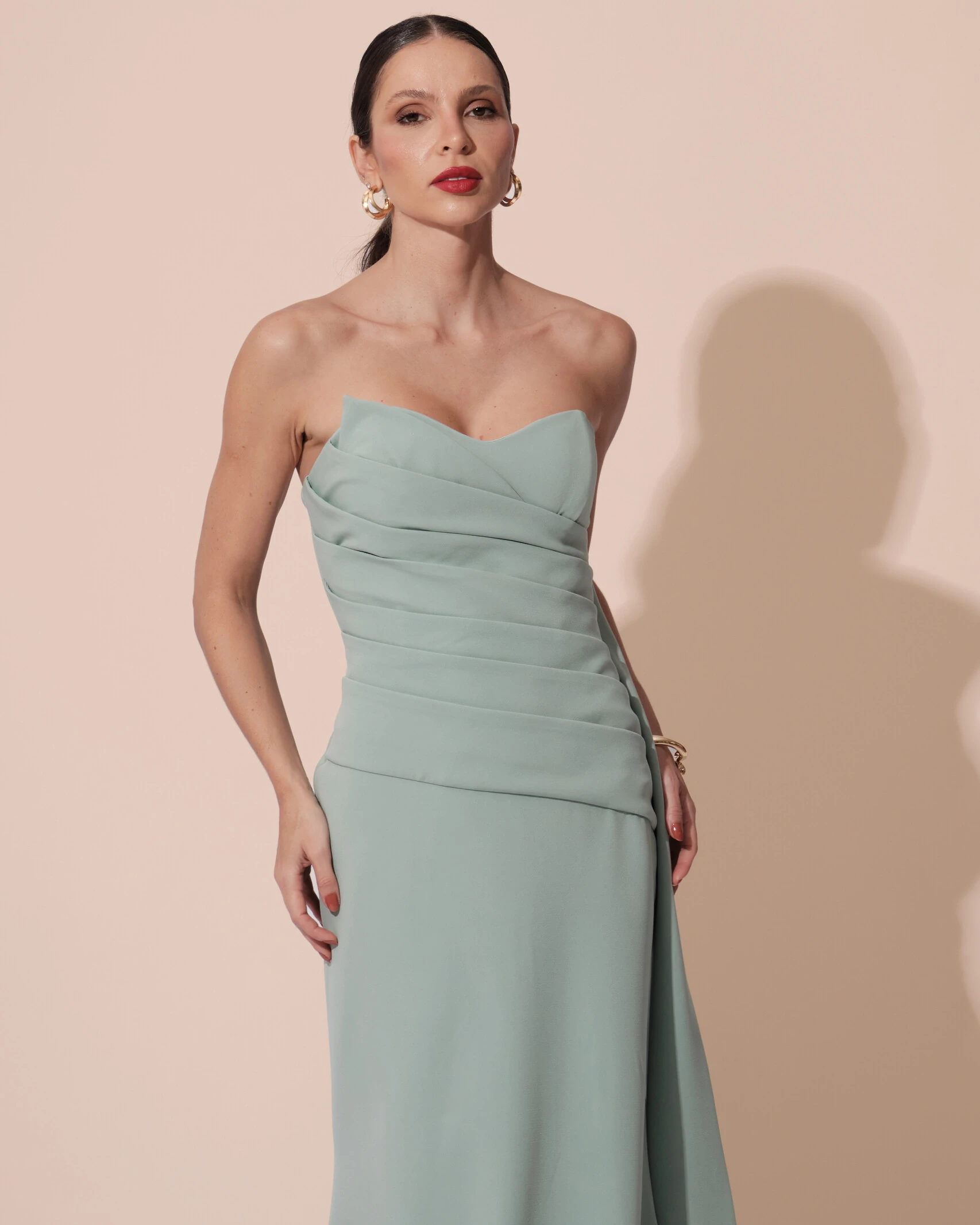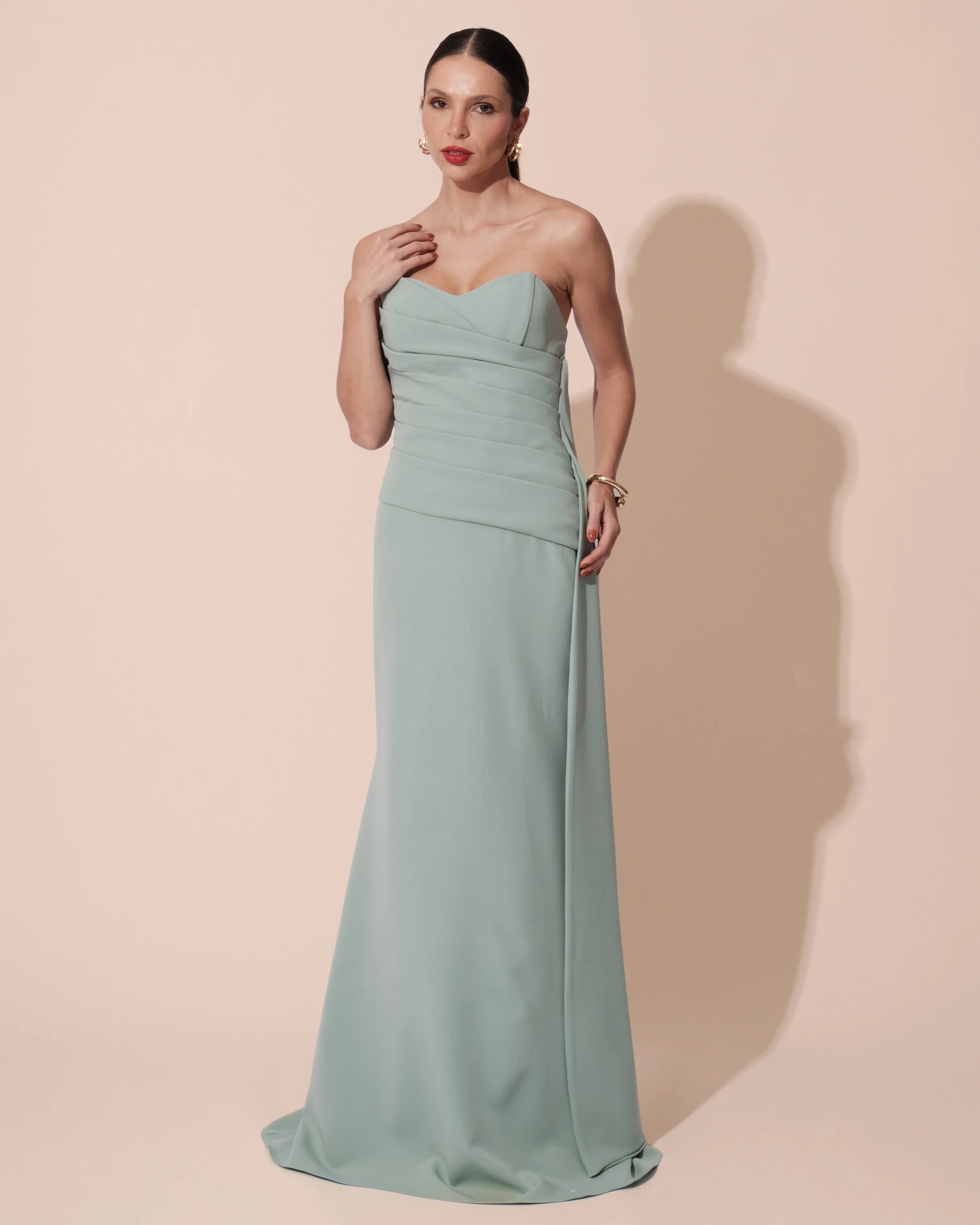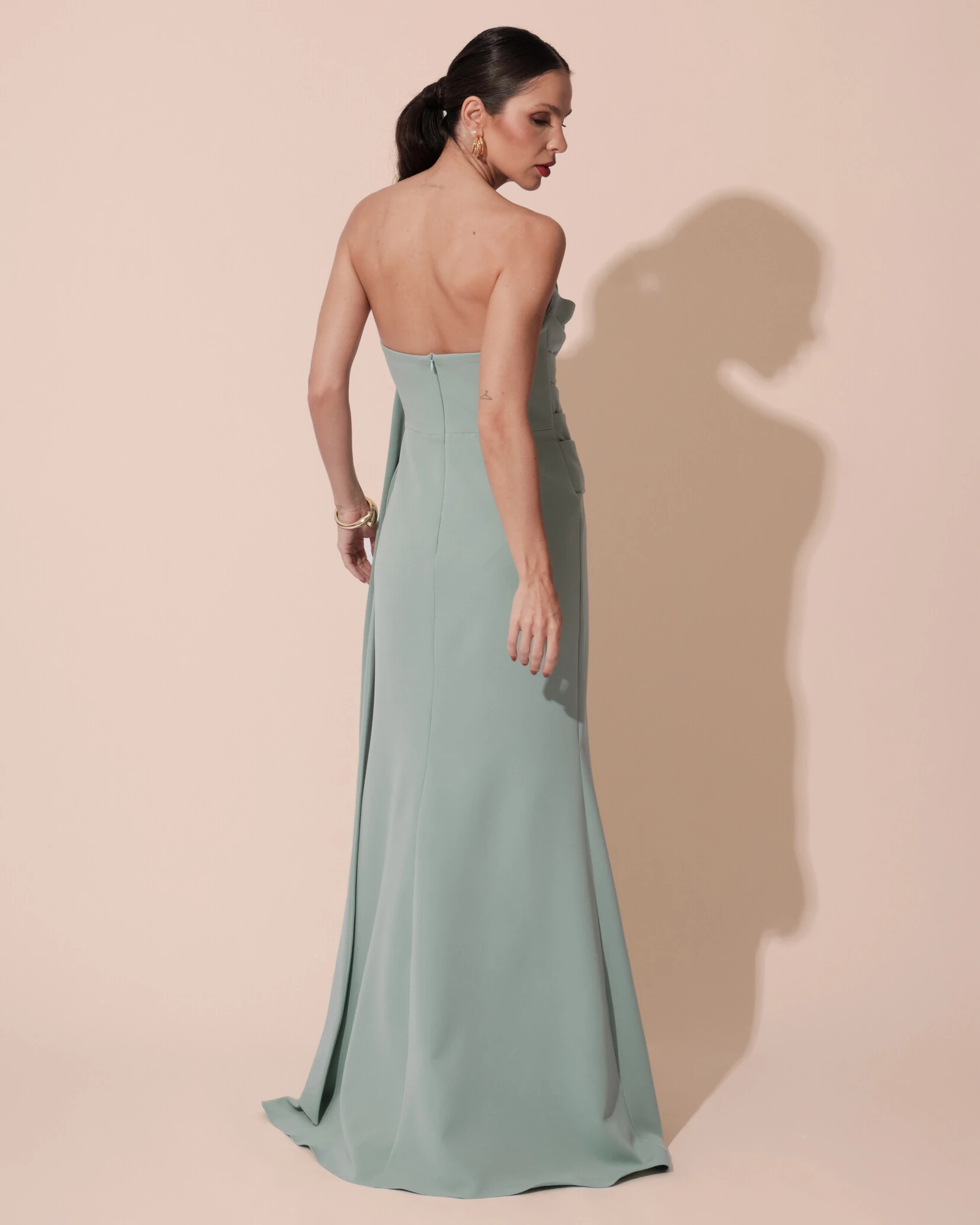 Vestido de Festa Longo Alfaiataria Tomara que Caia Drapeado Faixa Verde Menta