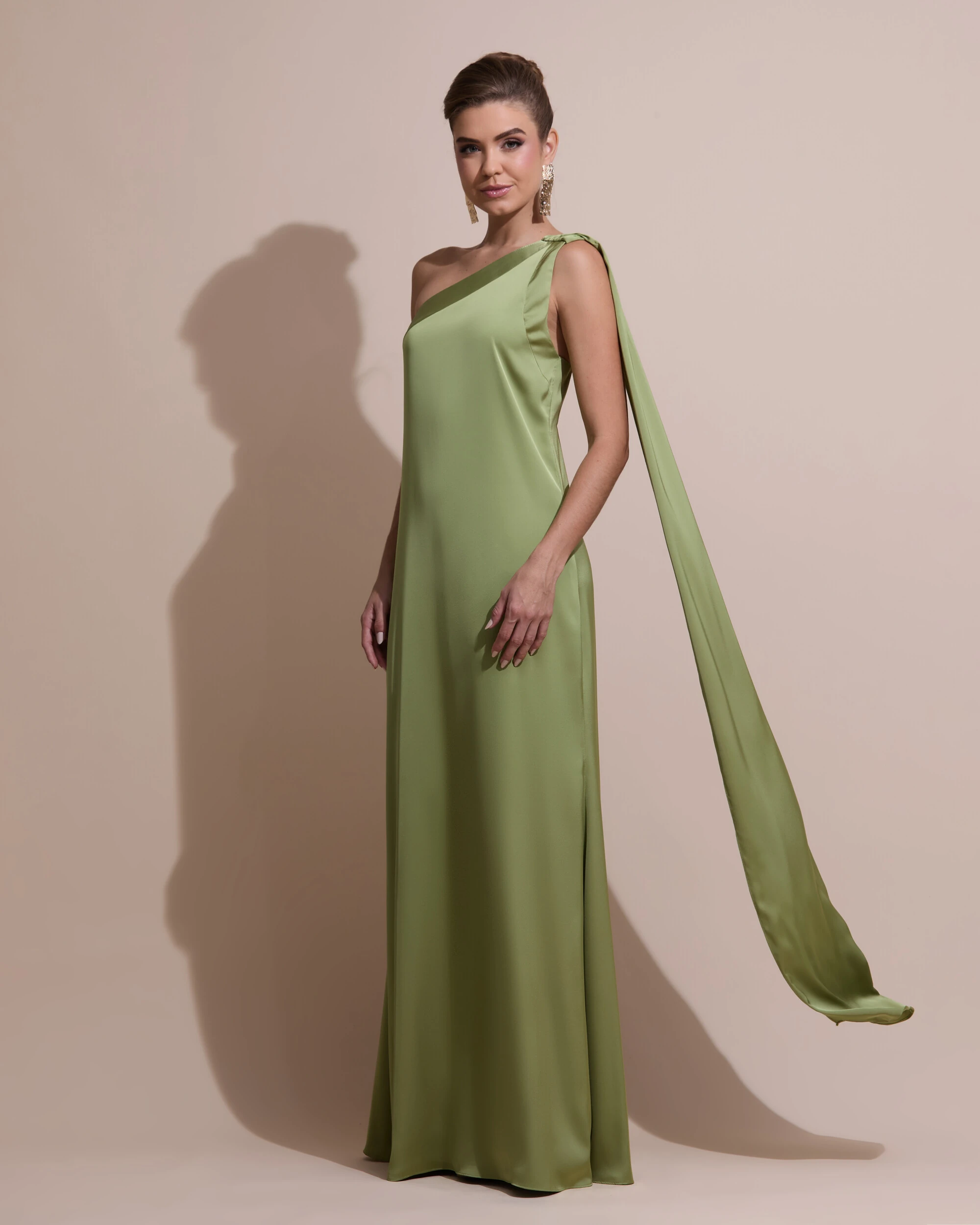 Confeccionado em cetim, o vestido apresenta um caimento leve e acetinado que valoriza o brilho e o movimento do tecido. O design de um ombro só com echarpe integrada cria uma silhueta elegante e moderna, enquanto o corte reto alonga a figura com sofisticação. O toque do cetim confere um ar luxuoso e fluido, perfeito para iluminar produções festivas com delicadeza e presença.