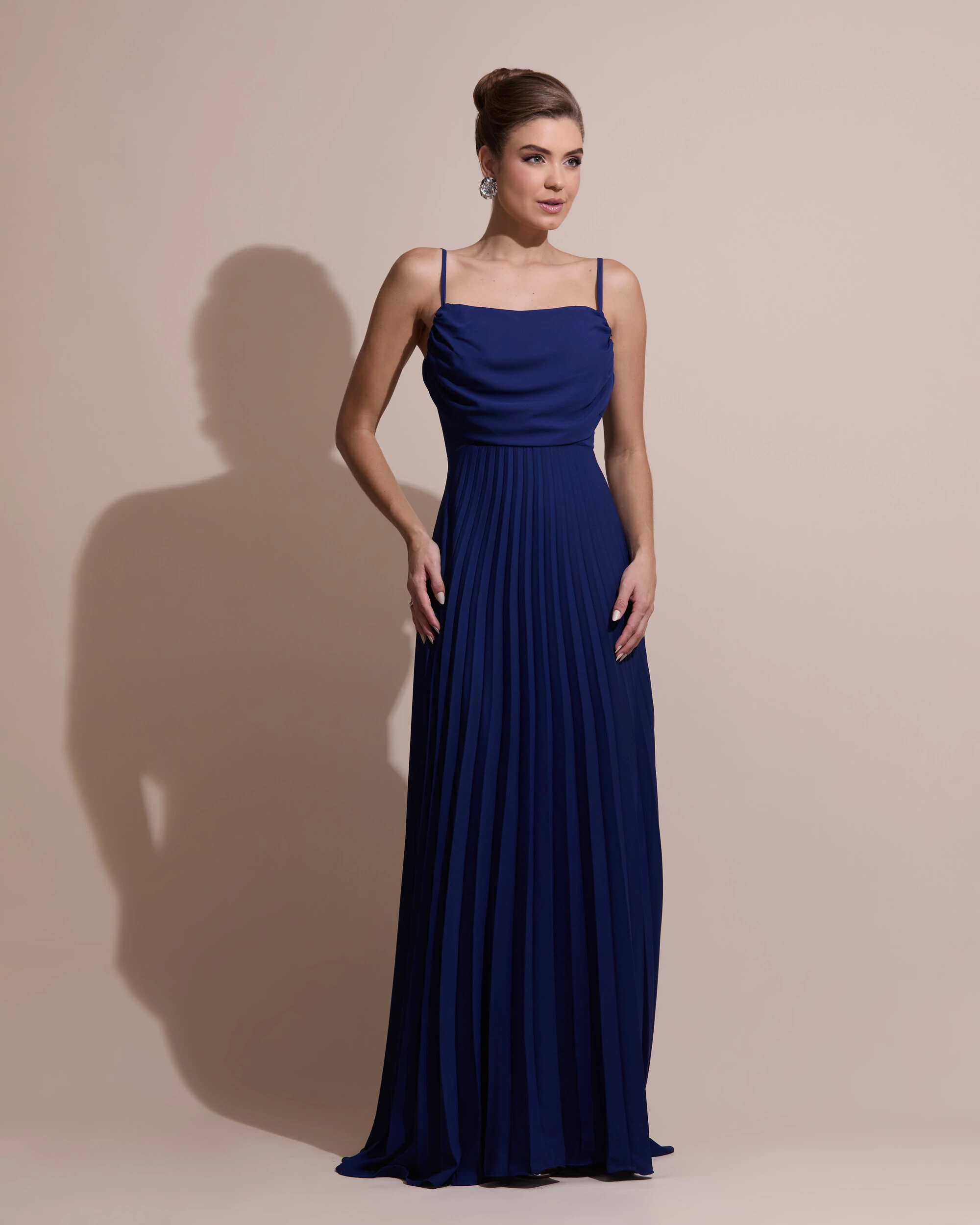 VESTIDO DE FESTA LONGO CREPE CHIFFON PLISSADO TRANÇADO E LENÇO - Vestido longo com modelagem fluida e elegante, com alças finas e busto levemente drapeado que valoriza o colo, enquanto a saia plissada traz movimento e sofisticação ao caminhar; ideal para ocasiões como casamentos ao ar livre, formaturas ou eventos noturnos mais refinados. Combine com sandálias de salto delicado, clutch minimalista e acessórios dourados ou prateados — brincos alongados ou pontos de luz funcionam perfeitamente — e, para um toque extra de charme, aposte em um penteado preso ou semi-preso que destaque a região dos ombros e o caimento do vestido.