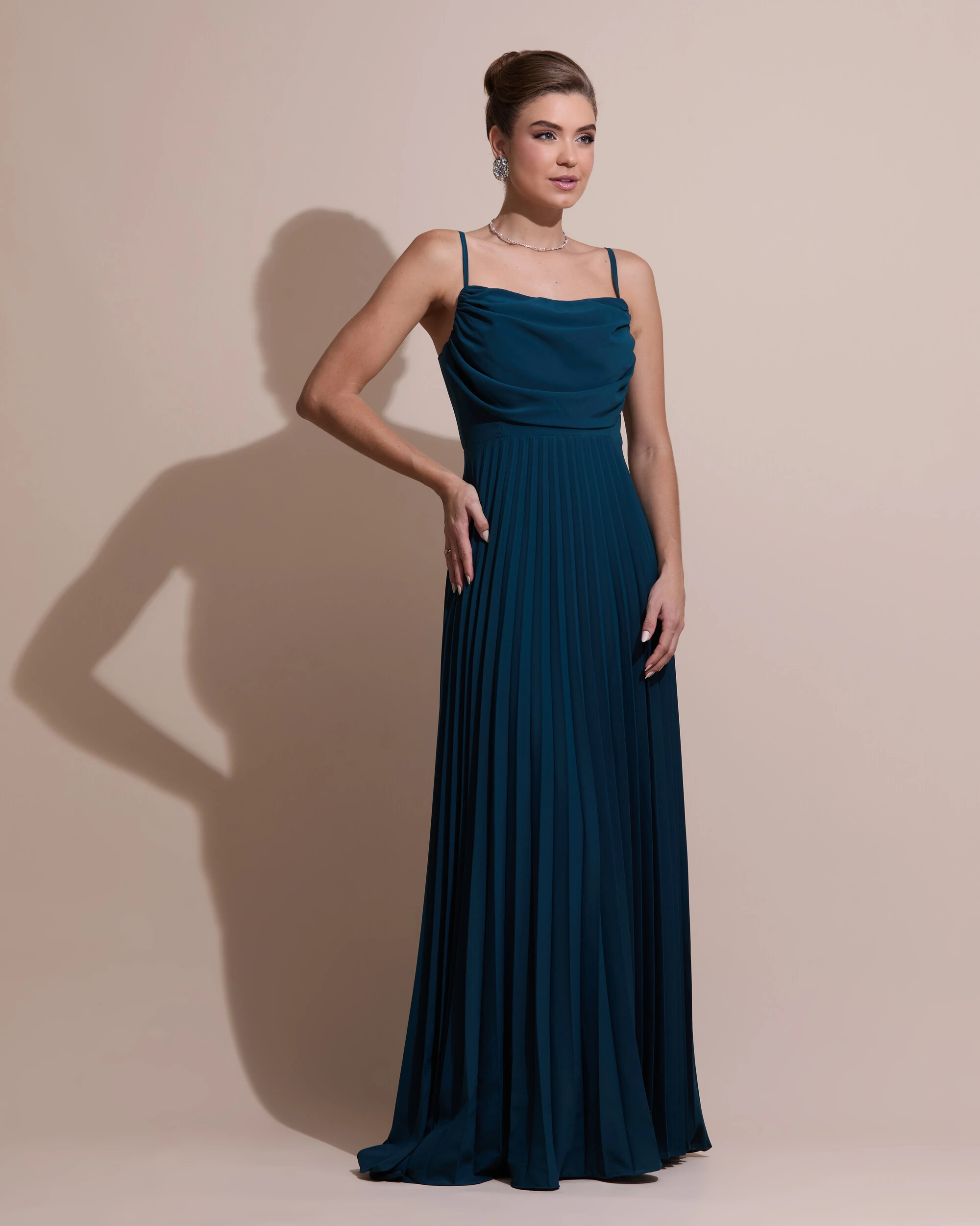 VESTIDO DE FESTA LONGO CREPE CHIFFON PLISSADO TRANÇADO E LENÇO - Vestido longo com modelagem fluida e elegante, com alças finas e busto levemente drapeado que valoriza o colo, enquanto a saia plissada traz movimento e sofisticação ao caminhar; ideal para ocasiões como casamentos ao ar livre, formaturas ou eventos noturnos mais refinados. Combine com sandálias de salto delicado, clutch minimalista e acessórios dourados ou prateados — brincos alongados ou pontos de luz funcionam perfeitamente — e, para um toque extra de charme, aposte em um penteado preso ou semi-preso que destaque a região dos ombros e o caimento do vestido.