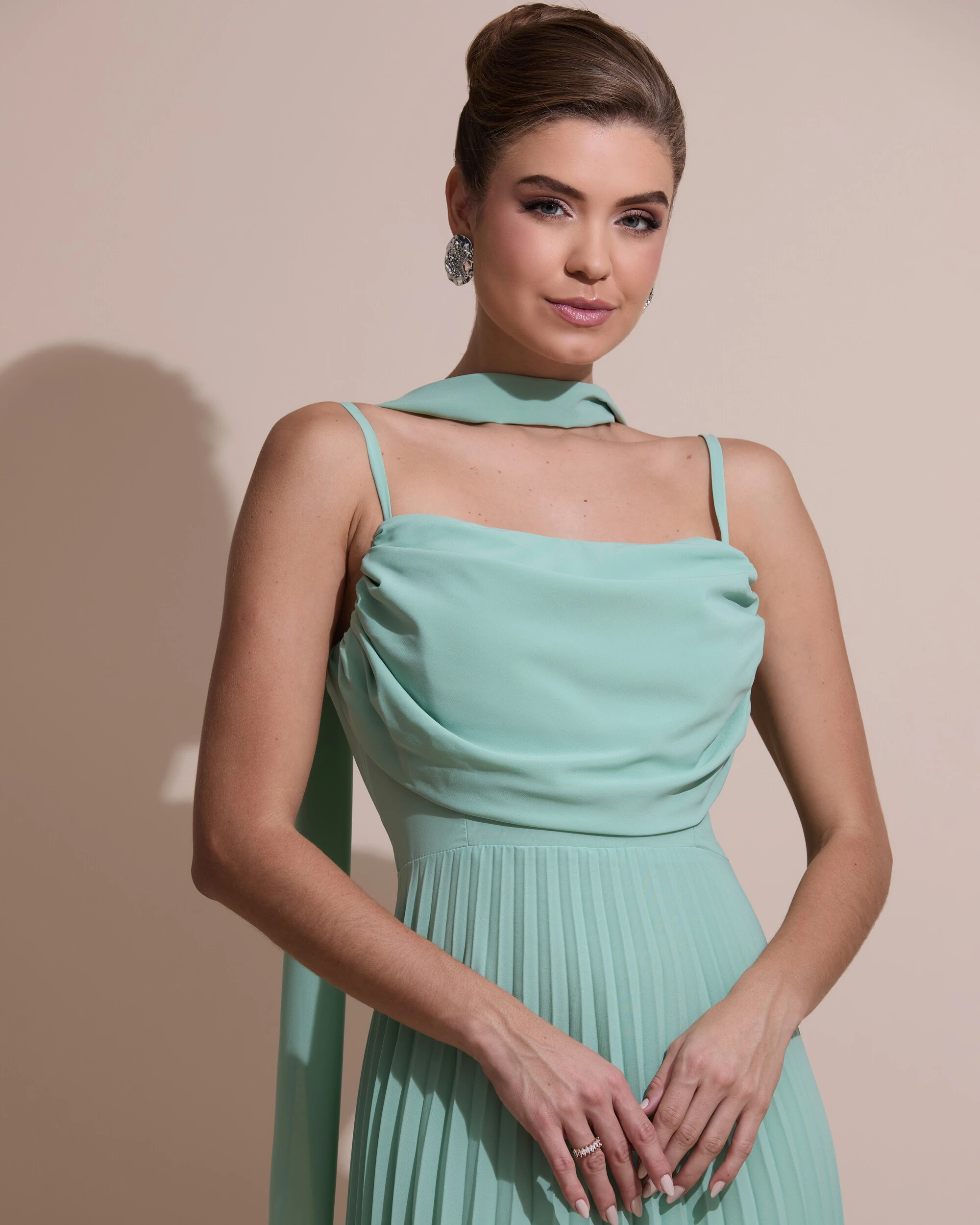 Vestido de Festa Longo Crepe Chiffon Plissado Trançado e Lenço Verde Menta