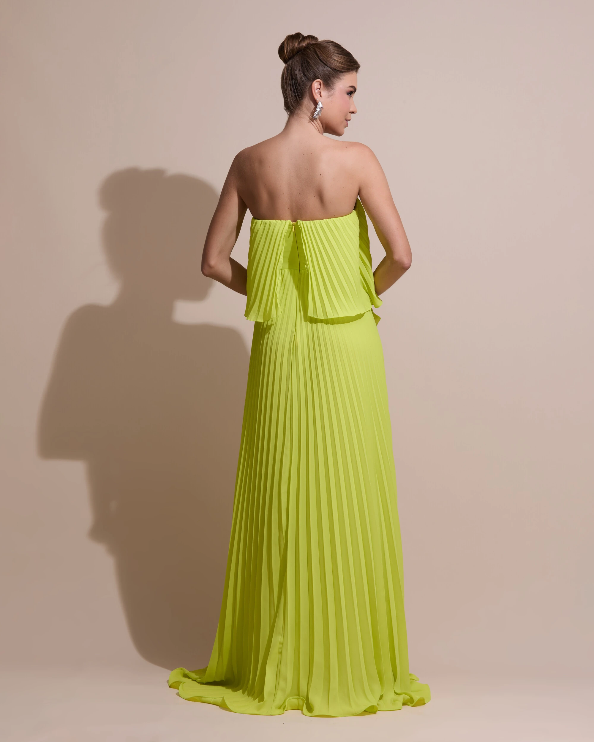 Vestido de Festa Longo Crepe Chiffon Tomara que Caia Plissado com Babado Cascata Verde Lima
