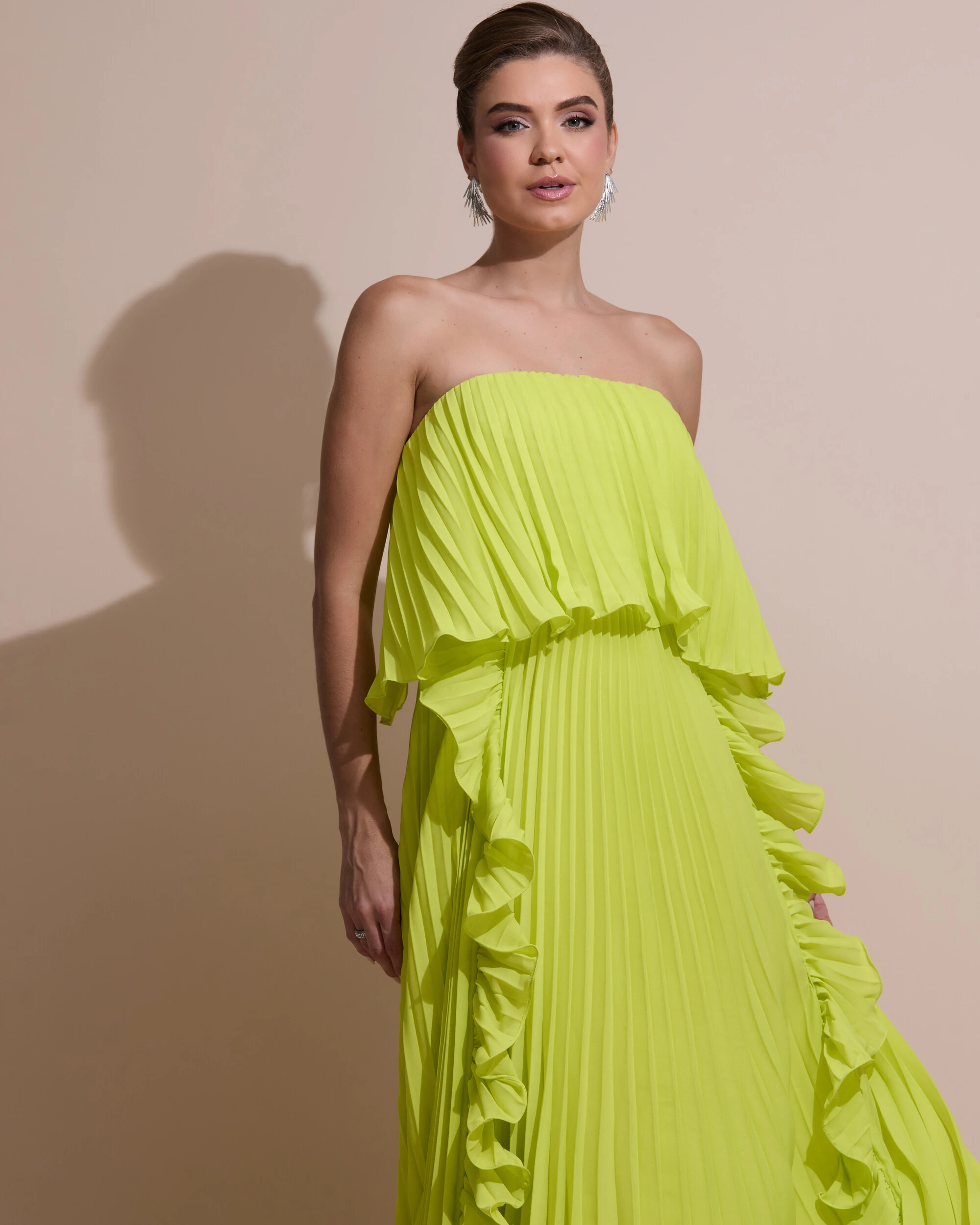 VESTIDO DE FESTA LONGO CREPE CHIFFON TOMARA QUE CAIA PLISSADO COM BABADO CASCATA - Com design leve e fluido, esse modelo tomara que caia traz movimento com seu plissado delicado e babados laterais que emolduram a silhueta de forma romântica e sofisticada. É uma escolha perfeita para eventos ao ar livre, casamentos durante o dia ou festas à beira-mar, combinando elegância e frescor. Para complementar, aposte em brincos longos ou argolas finas, pulseiras delicadas e um salto em tom neutro ou metálico. Um penteado preso valoriza o colo e realça o caimento fluido do look.