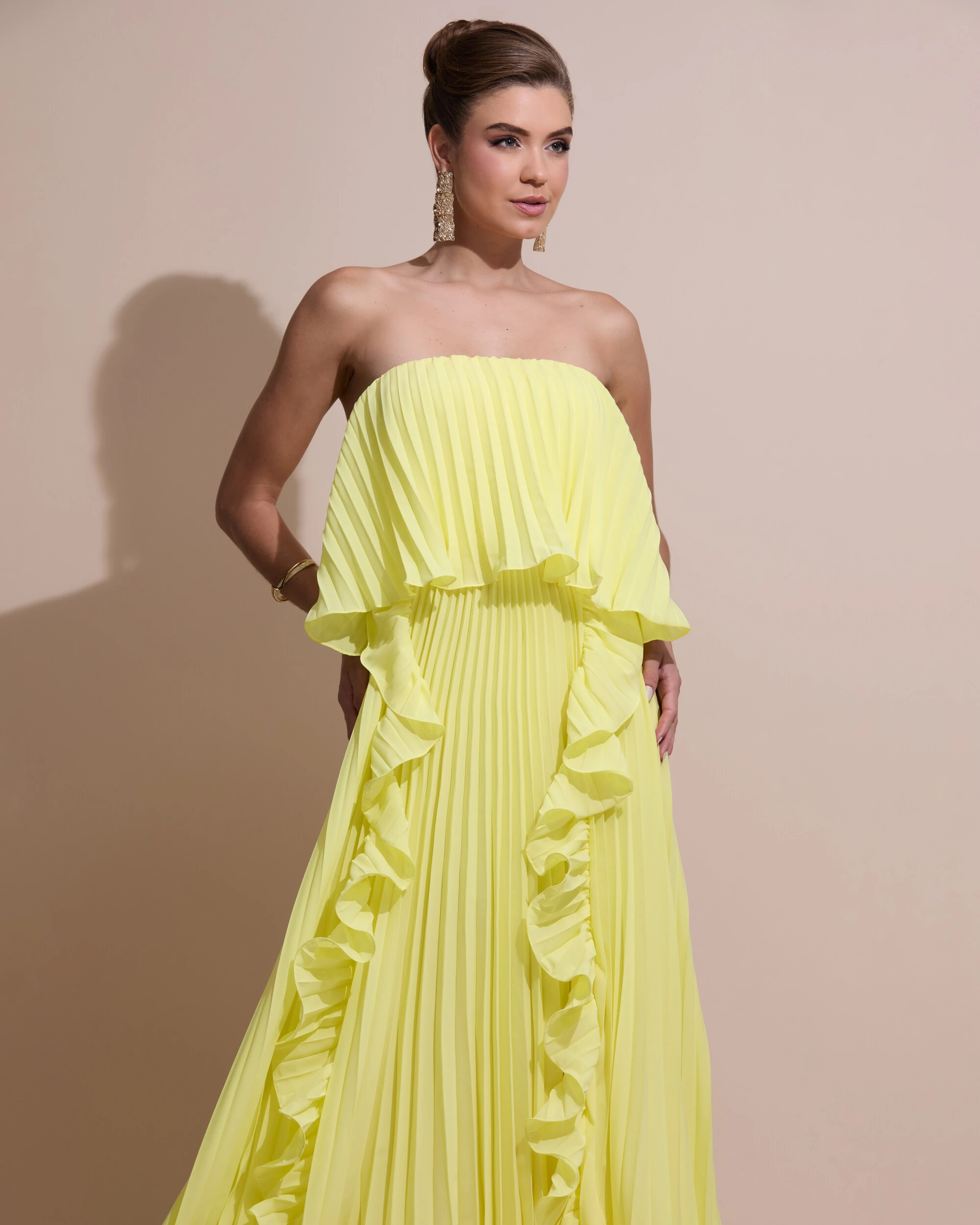 Confeccionado em crepe plissado, o modelo apresenta um caimento leve e fluido que valoriza a silhueta. Possui decote tomara que caia com babado duplo e aplicação de babados verticais nas laterais da saia, que trazem movimento e delicadeza ao visual. O plissado uniforme confere textura sofisticada e um efeito visual elegante em todo o comprimento da peça.