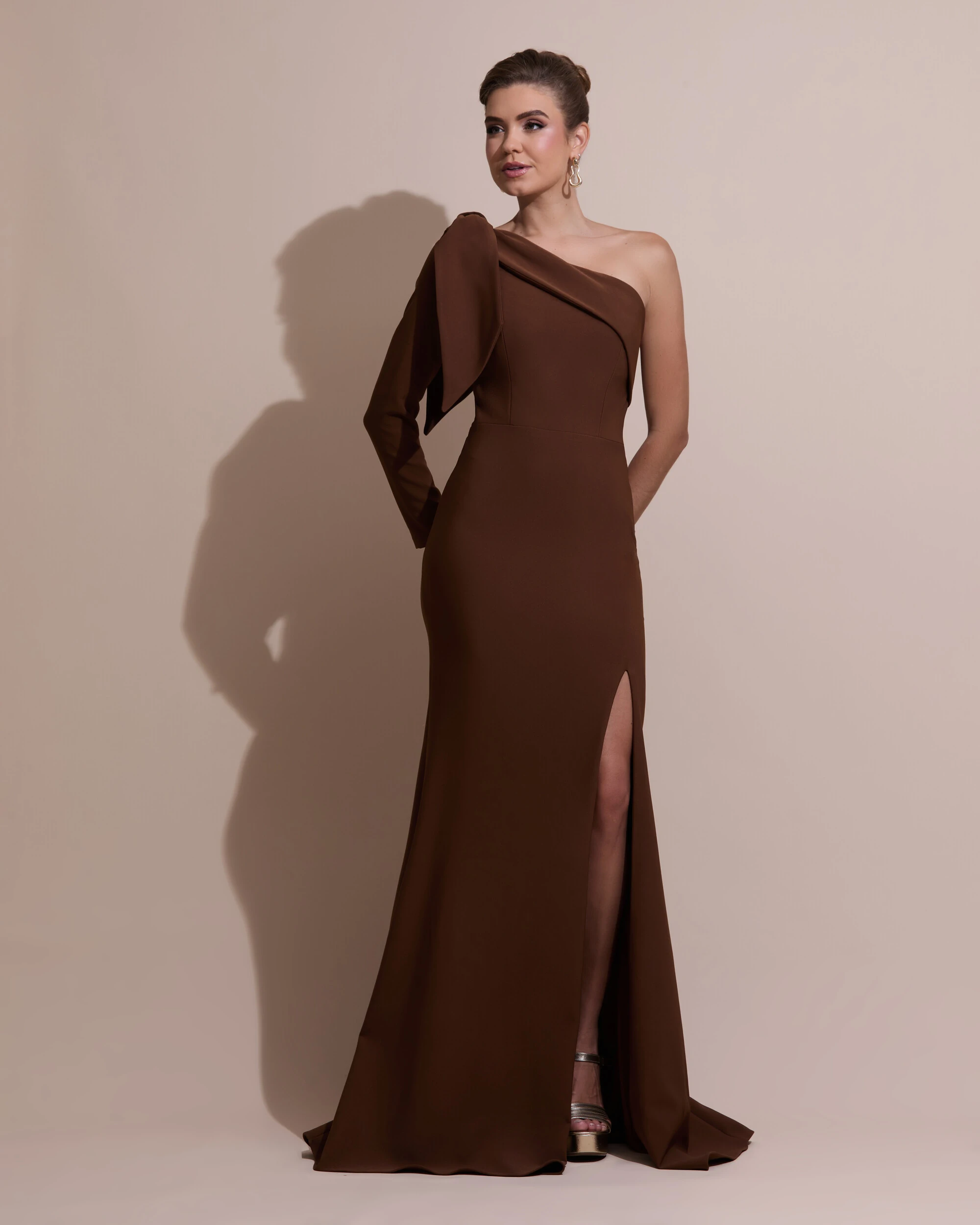 A peça possui um corte reto e impecável, que se ajusta suavemente ao corpo, proporcionando uma silhueta longa e esbelta. O detalhe de um único ombro, com um delicado laço amarrado, adiciona um toque de romantismo e modernidade, criando uma assimetria que é ao mesmo tempo sensual e refinada.