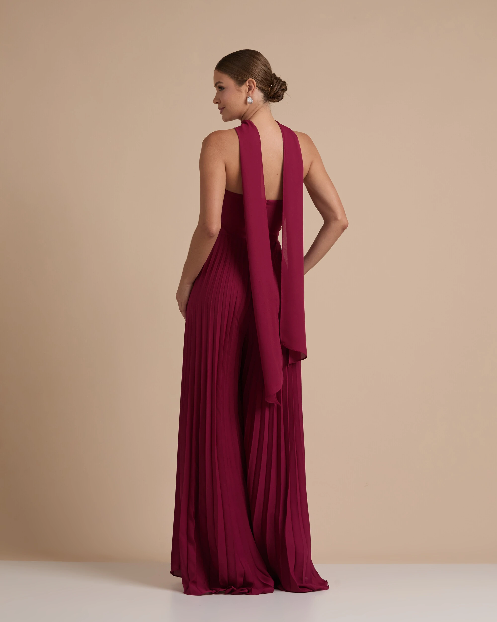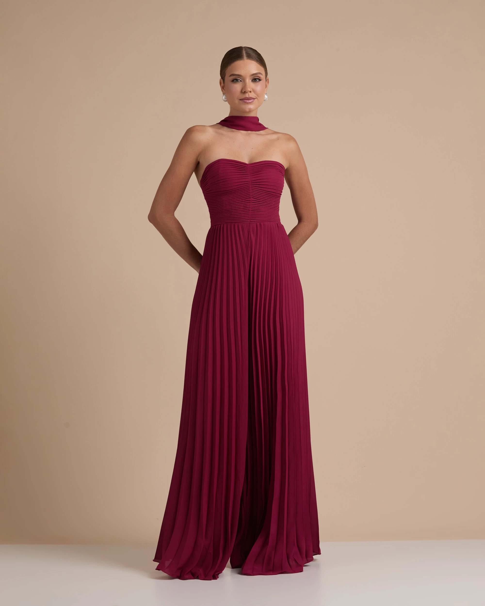 Macacão de Festa Longo Crepe Chiffon Tomara que Caia Plissado com Lenço Cereja