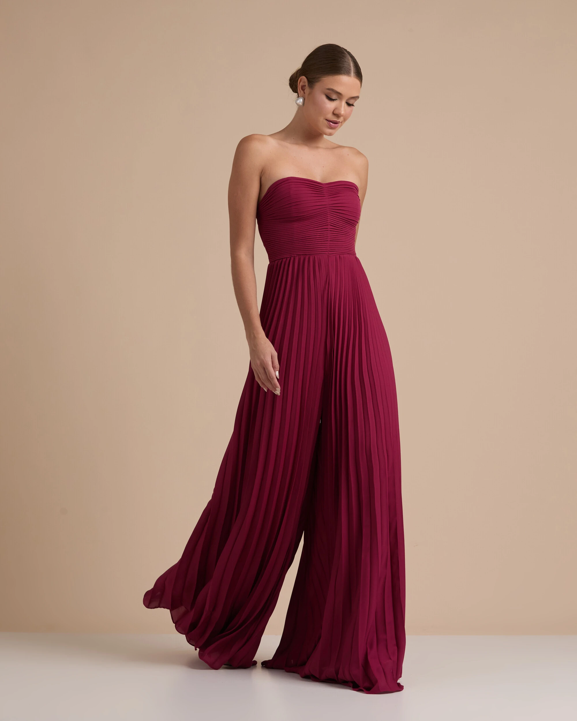 Macacão confeccionado em crepe plissado, com busto estruturado em estilo tomara que caia, marcado por delicados franzidos horizontais que criam textura e valorizam o colo. A cintura é levemente ajustada, proporcionando definição à silhueta, enquanto a parte inferior apresenta caimento amplo com plissado vertical, garantindo fluidez, movimento e alongamento. O modelo conta ainda com acabamento leve e sofisticado, além de detalhe de faixa que complementa o design com elegância.