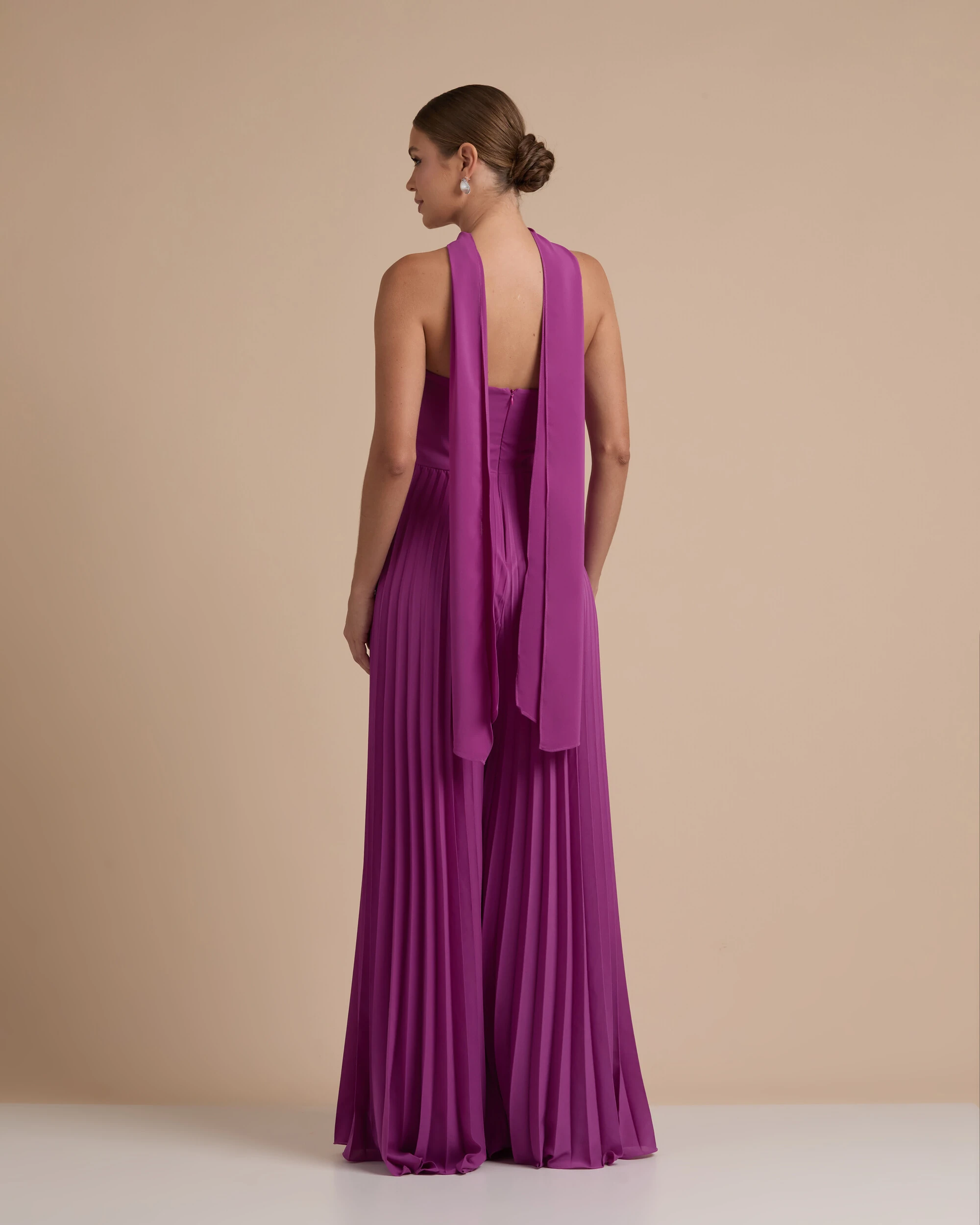 MACACÃO DE FESTA LONGO CREPE CHIFFON TOMARA QUE CAIA PLISSADO COM LENÇO - Macacão elegante de modelagem fluida, com busto estruturado e franzidos que valorizam o colo, trazendo um toque sofisticado e feminino, enquanto a parte inferior em tecido leve e plissado cria movimento e alonga a silhueta. Ideal para eventos como casamentos ao ar livre, formaturas, festas de gala ou jantares especiais, ele transita perfeitamente entre o dia e a noite. Combine com sandálias de salto fino ou metalizadas para um visual mais refinado, clutch minimalista e brincos alongados ou pontos de luz; para um toque fashionista, aposte em um coque baixo ou cabelo preso e uma maquiagem iluminada.