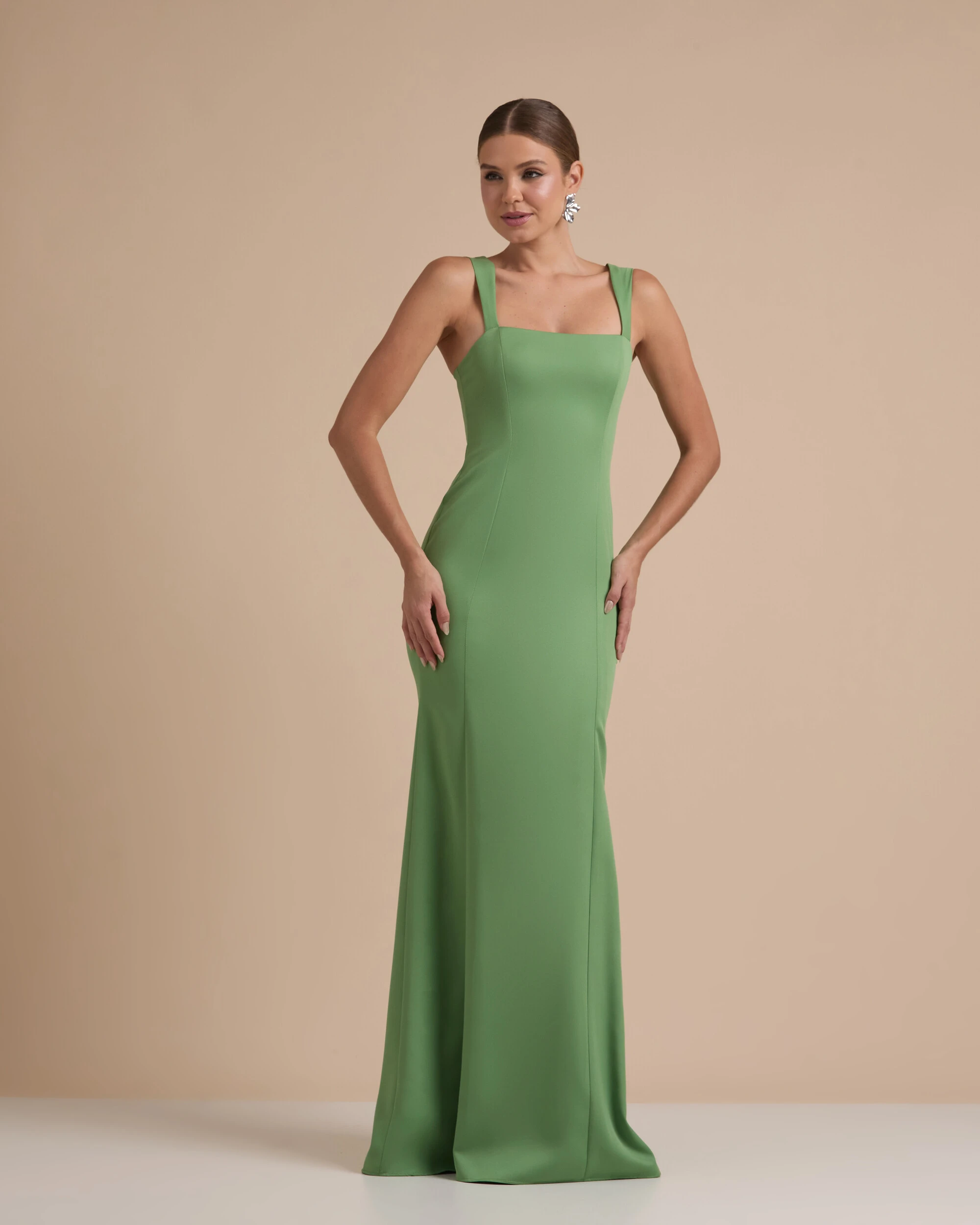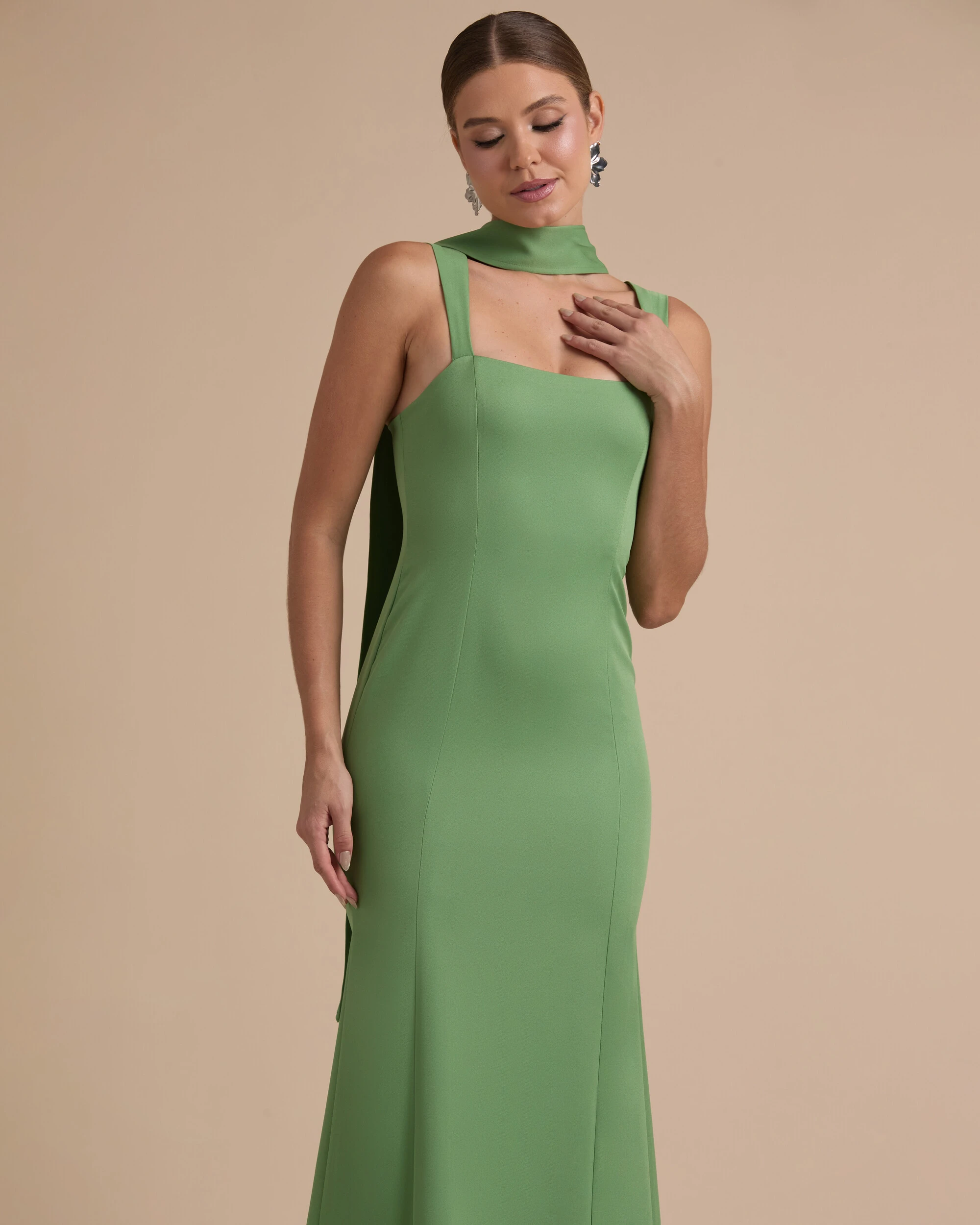 Vestido de Festa Longo Alfaiataria Alça Larga e Lenço Verde Matcha