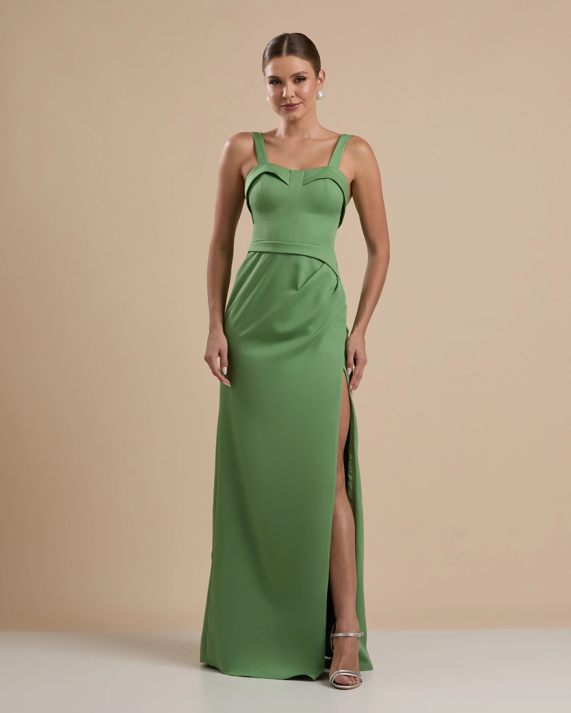 Vestido longo confeccionado em alfaiataria, com estrutura firme e acabamento impecável que valoriza o caimento no corpo. Possui alças delicadas e busto estruturado com recortes que modelam e sustentam, além de cintura marcada que define a silhueta. A saia apresenta leve drapeado estratégico e fenda frontal, proporcionando movimento e elegância, com toque moderno e sofisticado.