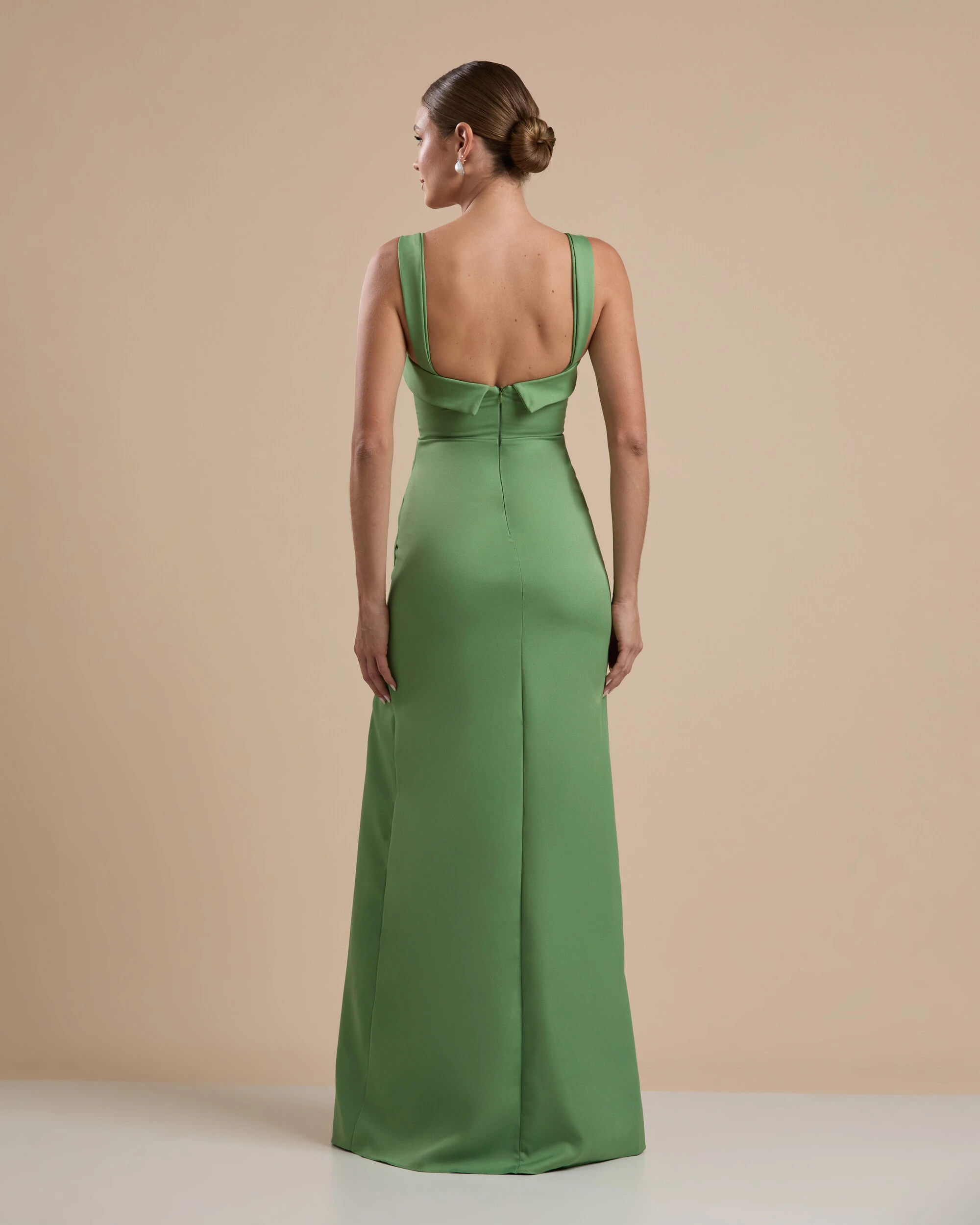 Vestido de Festa Longo Alfaiataria Decote Coração com Alças e Fenda Verde Matcha