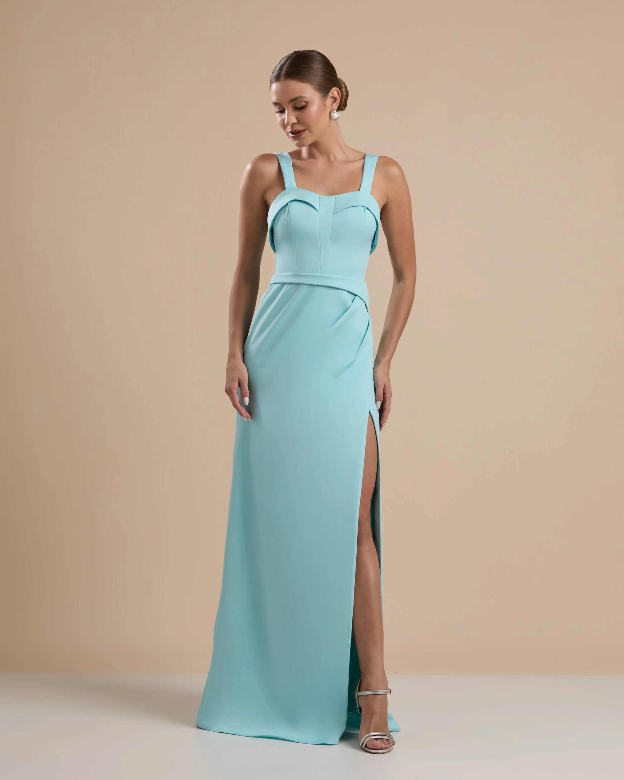Vestido longo confeccionado em alfaiataria, com estrutura firme e acabamento impecável que valoriza o caimento no corpo. Possui alças delicadas e busto estruturado com recortes que modelam e sustentam, além de cintura marcada que define a silhueta. A saia apresenta leve drapeado estratégico e fenda frontal, proporcionando movimento e elegância, com toque moderno e sofisticado.