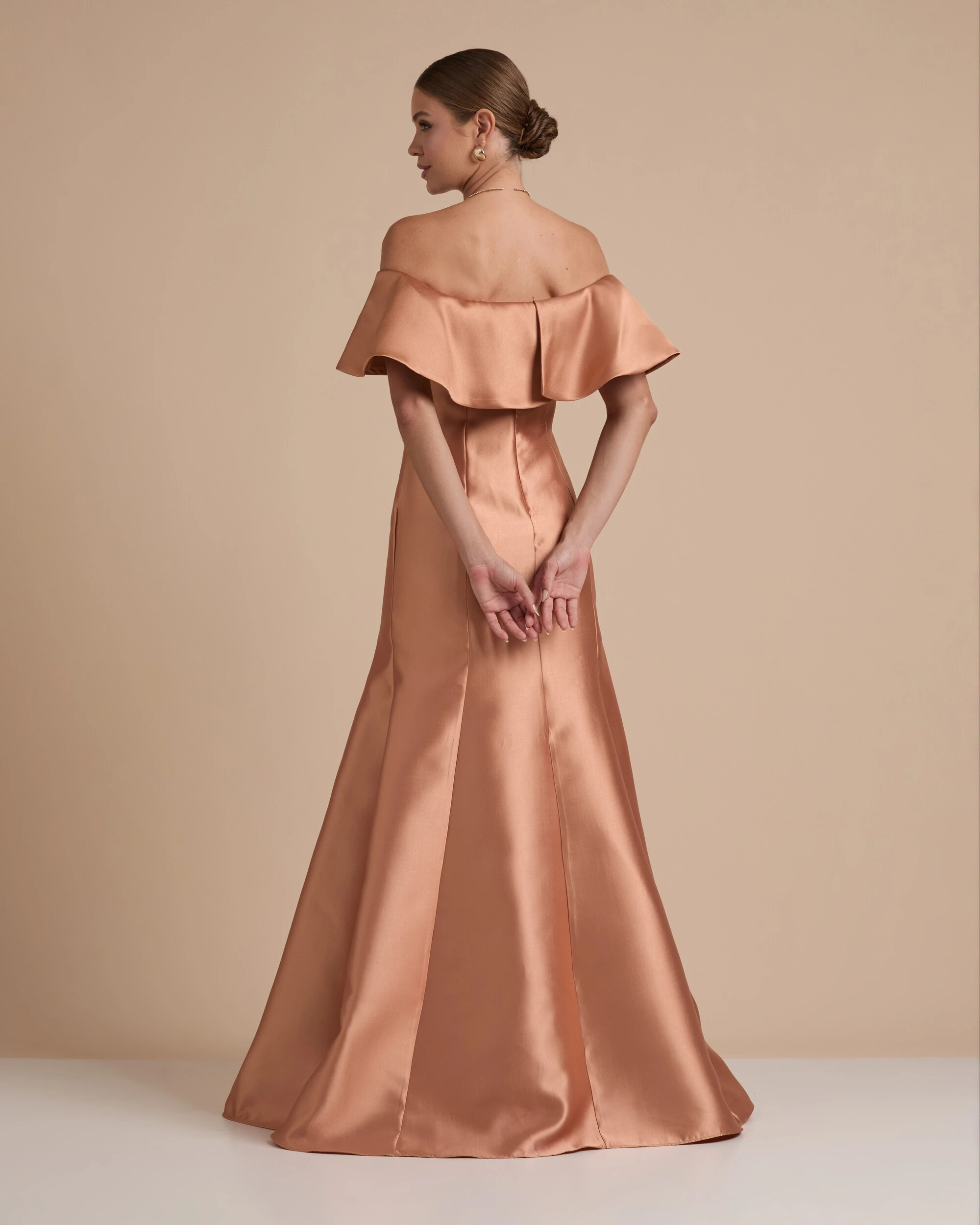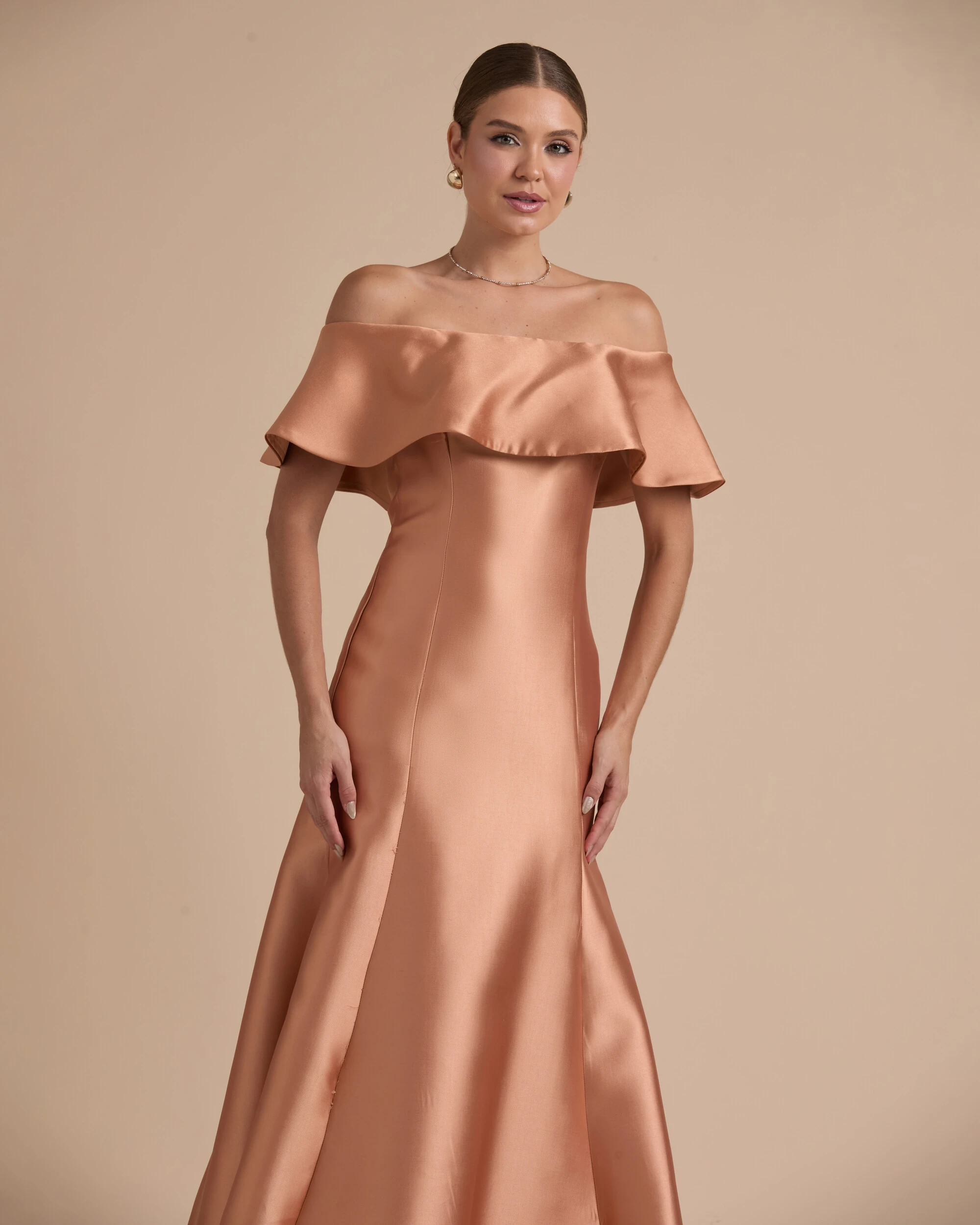 O vestido confeccionado em tecido zibeline apresenta um design elegante e estruturado, com modelagem longa e caimento levemente em evasê que confere sofisticação ao visual. Possui decote ombro a ombro com um babado amplo que contorna o busto e os braços, adicionando volume e um toque romântico à peça. O tecido encorpado e com brilho acetinado do zibeline realça a estrutura do vestido, valorizando sua silhueta ajustada ao corpo.