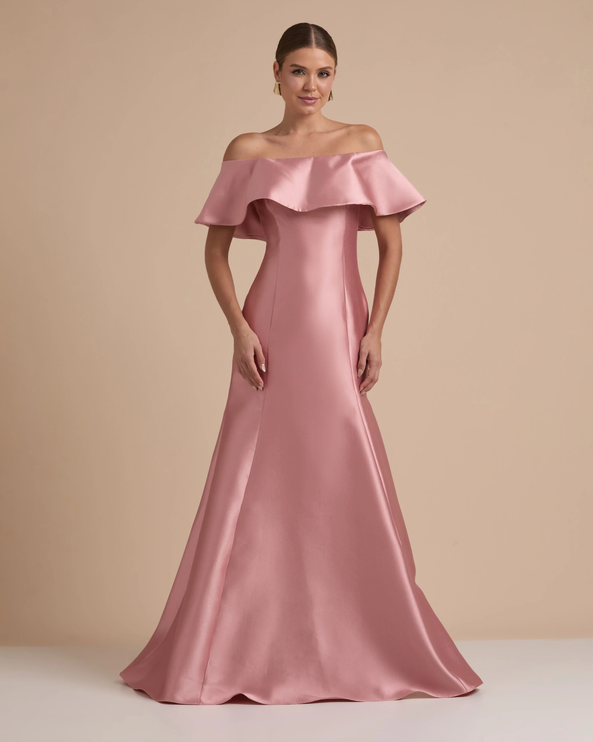 O vestido confeccionado em tecido zibeline apresenta um design elegante e estruturado, com modelagem longa e caimento levemente em evasê que confere sofisticação ao visual. Possui decote ombro a ombro com um babado amplo que contorna o busto e os braços, adicionando volume e um toque romântico à peça. O tecido encorpado e com brilho acetinado do zibeline realça a estrutura do vestido, valorizando sua silhueta ajustada ao corpo.