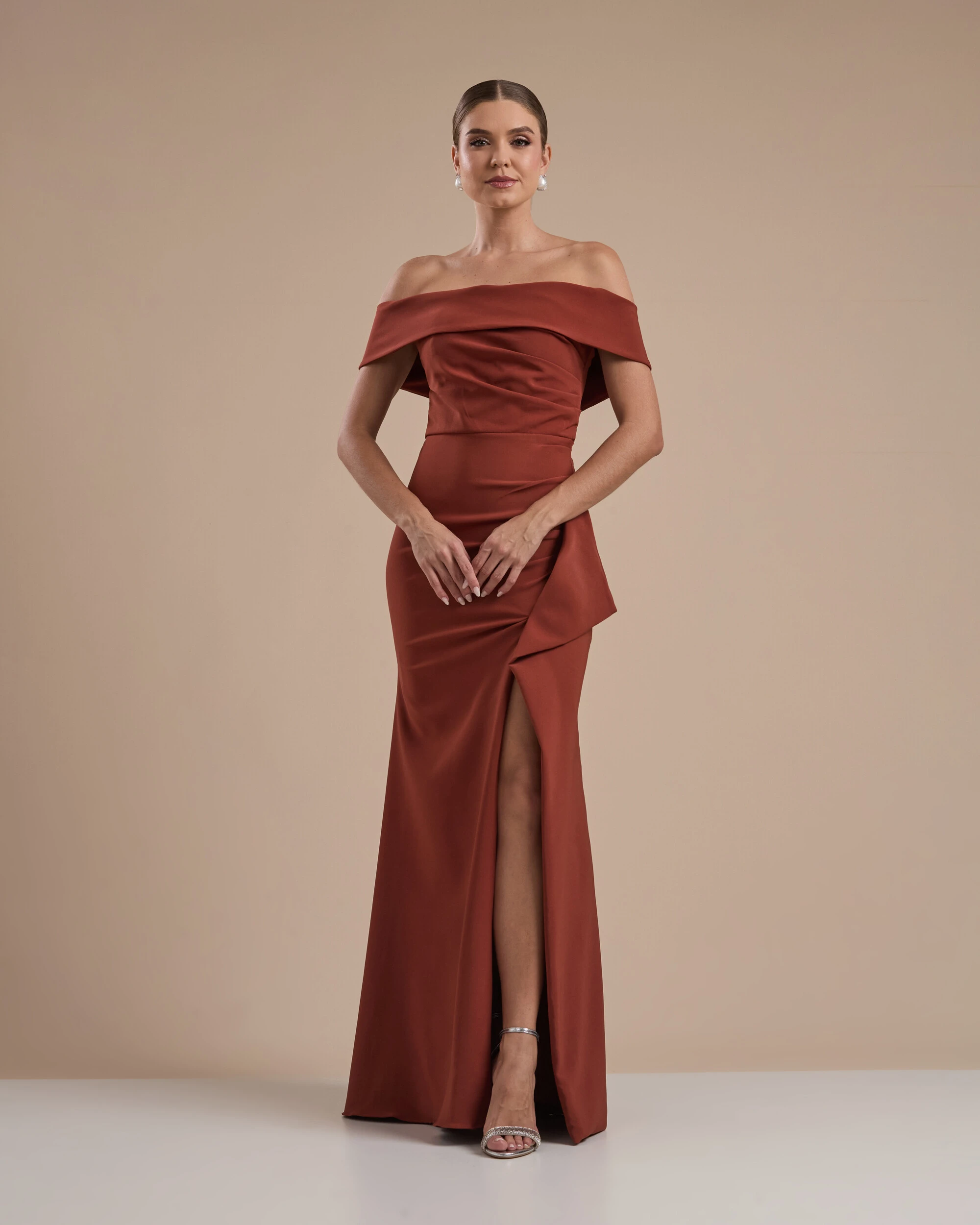 Vestido de Festa Longo Ombro a Ombro com Fenda em Alfaiataria Terracota