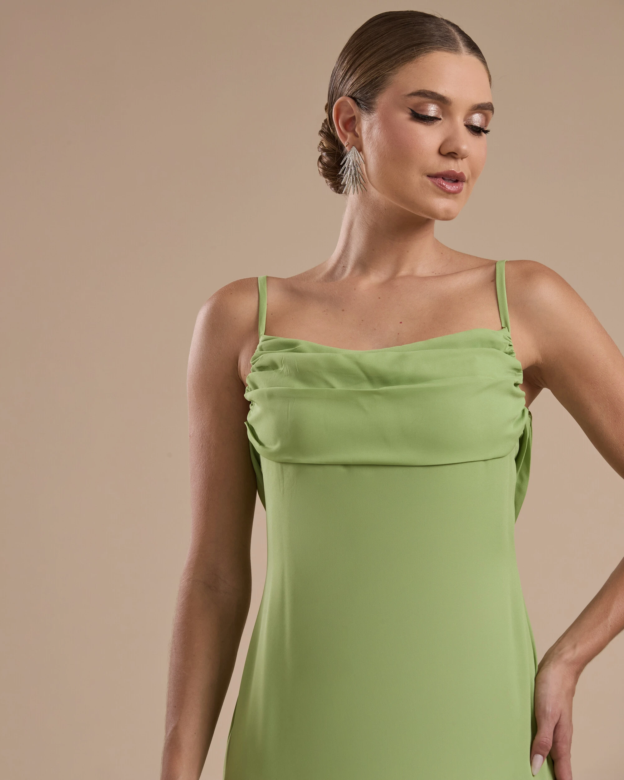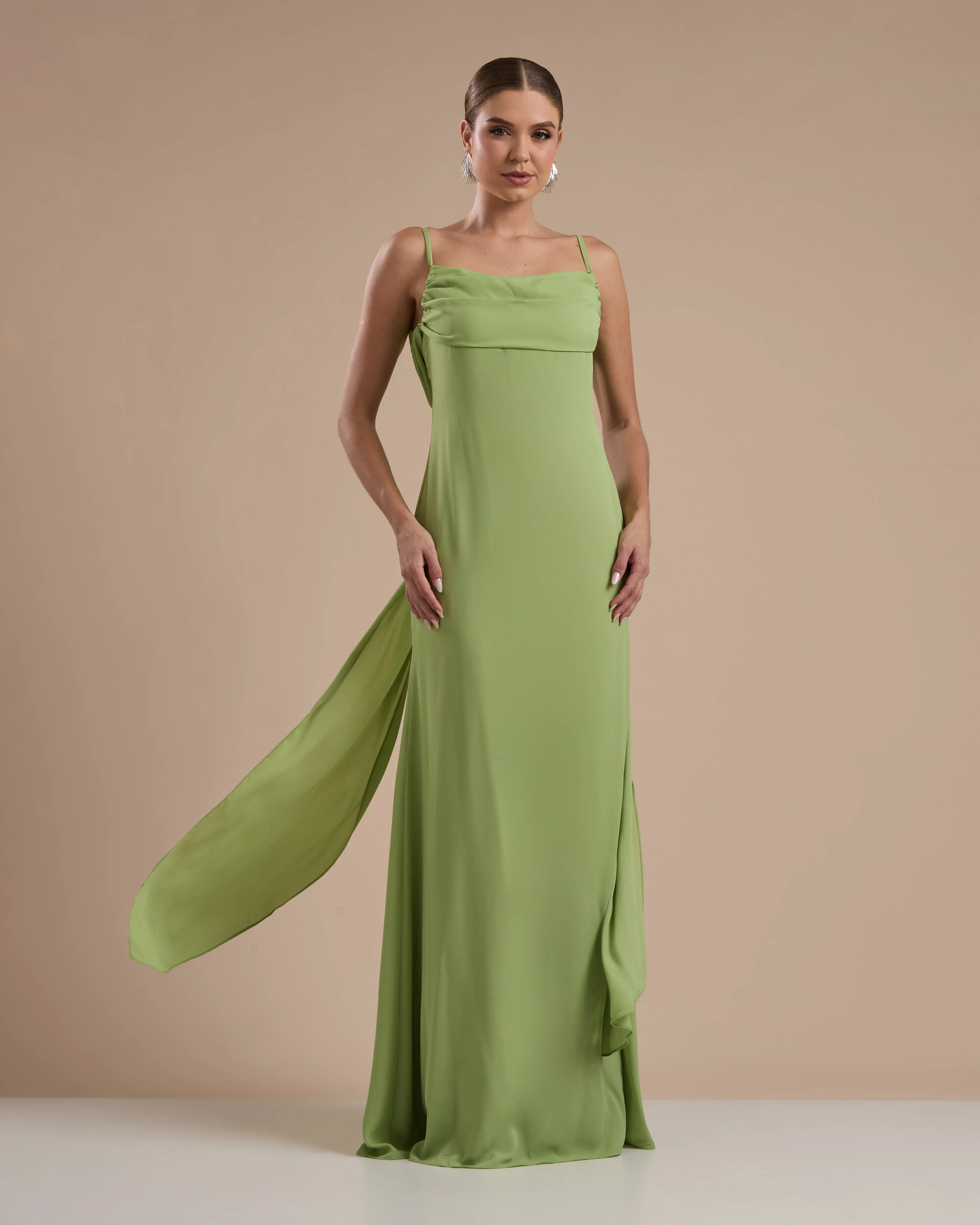 VESTIDO DE FESTA LONGO CREPE CHIFFON COSTAS LENÇO CAUDA  - Este vestido longo traz um caimento elegante e minimalista, destacando o colo com alças finas e um decote delicadamente drapeado, enquanto a parte de trás revela um visual mais aberto e sofisticado. Para complementar, acessórios prateados ou dourados delicados, como brincos alongados e uma pulseira fina, criam um equilíbrio perfeito sem tirar o protagonismo da peça; já a escolha de uma clutch estruturada e sandálias de salto fino reforça a proposta refinada. Ideal para casamentos ao ar livre, formaturas, jantares especiais ou eventos sociais que pedem um look elegante, ele combina leveza e presença de forma impecável.