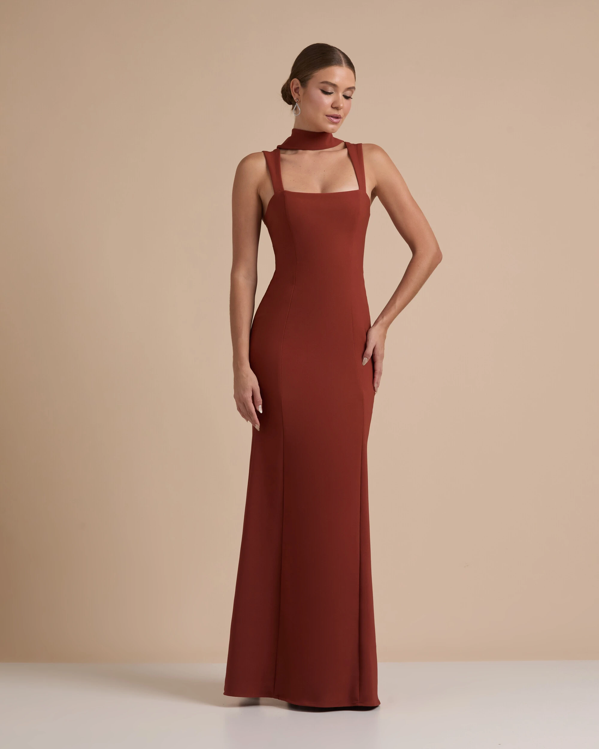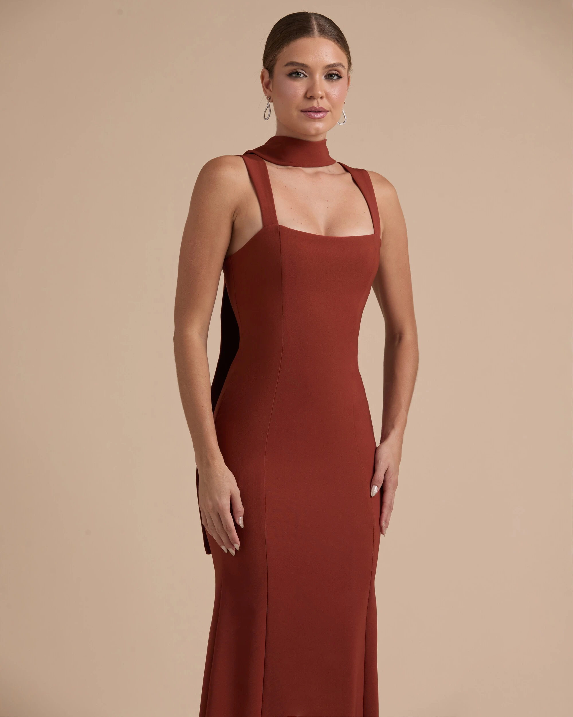 Vestido longo confeccionado em tecido de alfaiataria, com modelagem ajustada ao corpo que valoriza a silhueta de forma elegante, apresentando decote reto e alças largas que garantem sustentação e acabamento sofisticado. Possui recortes estratégicos que estruturam a peça e proporcionam caimento impecável, além de lenço que complementa o design com um toque moderno e versátil, agregando charme e personalidade ao visual.
