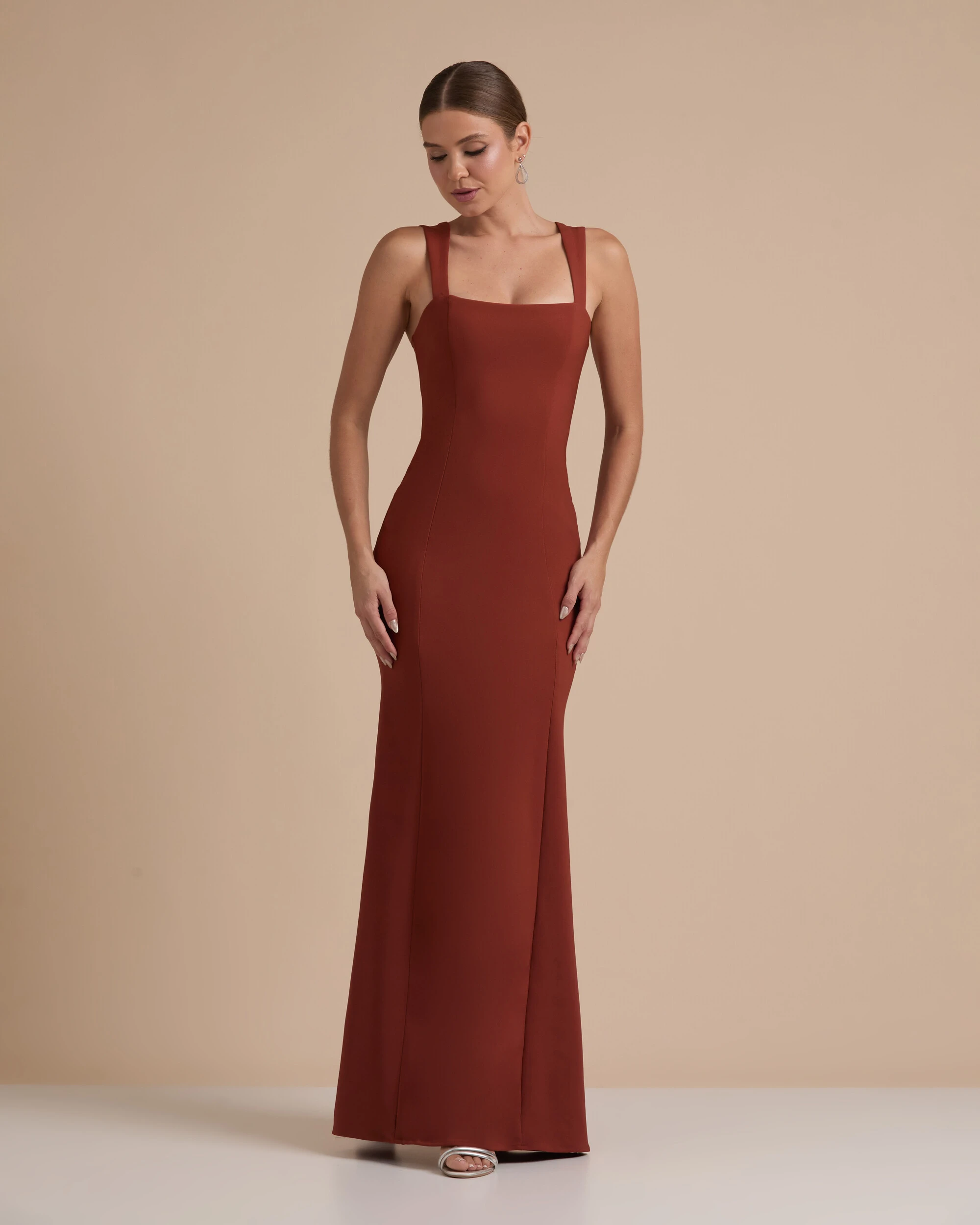 VESTIDO DE FESTA LONGO ALFAIATARIA ALÇA LARGA E Lenço - Vestido longo de modelagem ajustada que valoriza a silhueta, com decote reto e alças largas que trazem sustentação e elegância na medida certa, perfeito para ocasiões como casamentos, formaturas, festas noturnas ou eventos sofisticados em salões e espaços modernos. Combine com sandálias de salto fino, clutch estruturada e acessórios delicados como brincos alongados ou pontos de luz para um visual refinado; para uma proposta mais impactante, aposte em um cabelo preso ou semi-preso e maquiagem marcante, equilibrando sofisticação e presença.