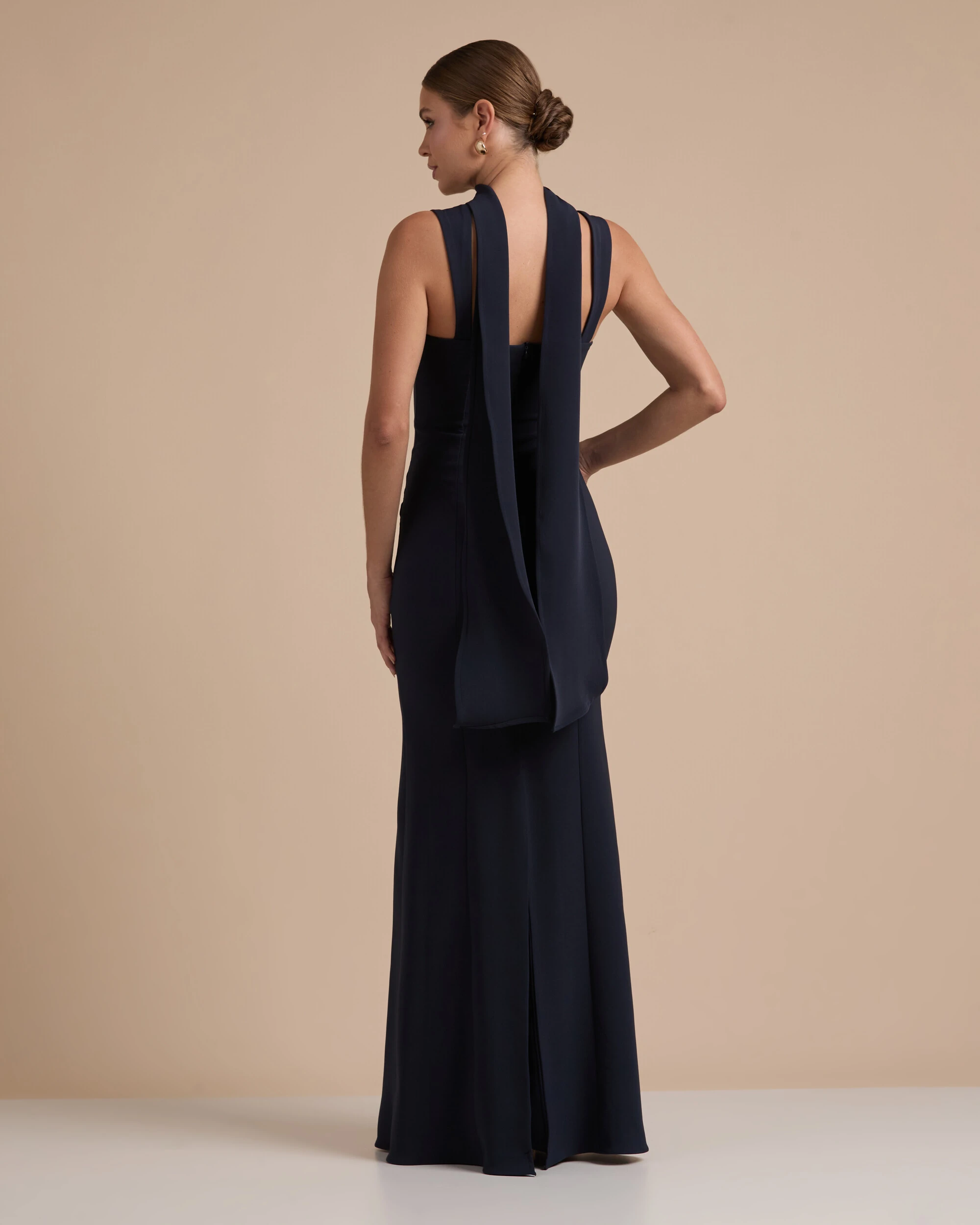 Vestido longo confeccionado em tecido de alfaiataria, com modelagem ajustada ao corpo que valoriza a silhueta de forma elegante, apresentando decote reto e alças largas que garantem sustentação e acabamento sofisticado. Possui recortes estratégicos que estruturam a peça e proporcionam caimento impecável, além de lenço que complementa o design com um toque moderno e versátil, agregando charme e personalidade ao visual.