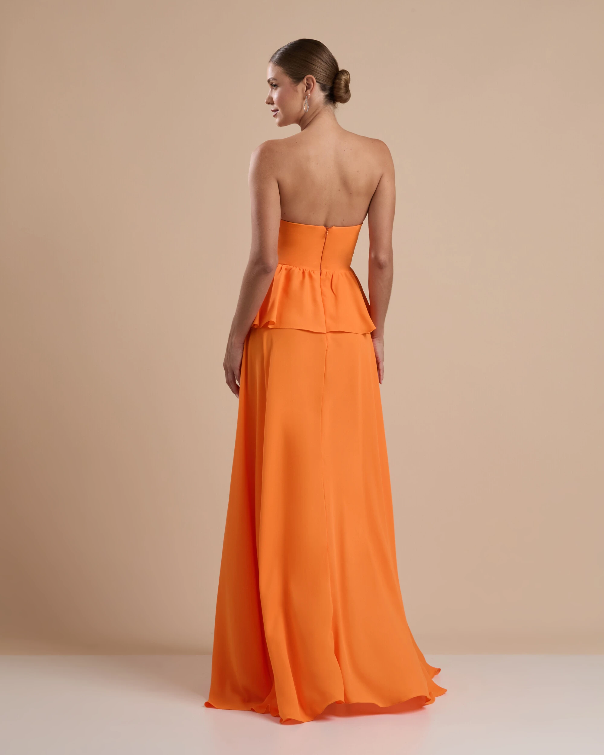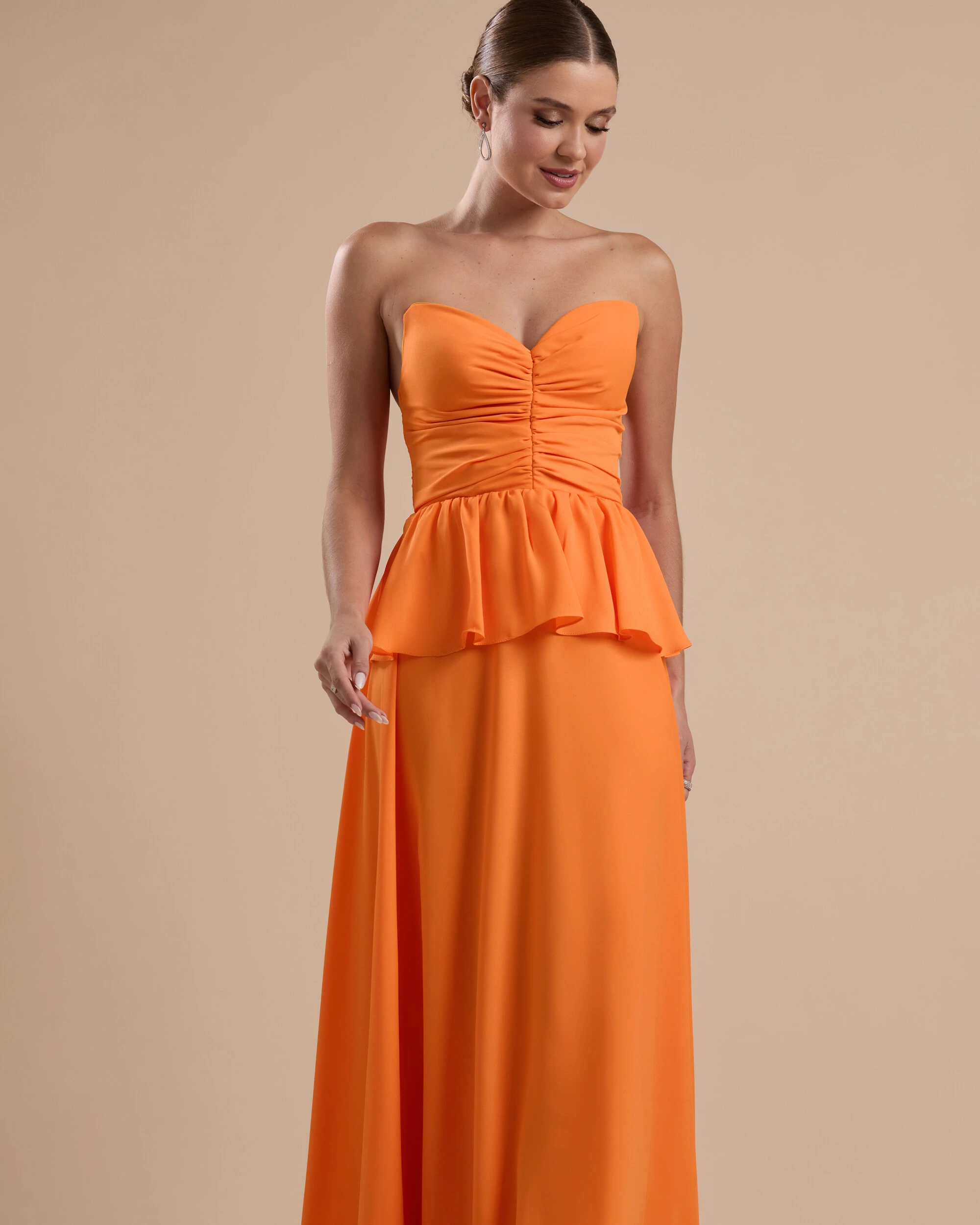 VESTIDO DE FESTA LONGO CREPE CHIFFON TOMARA QUE CAIA PEPLUM DRAPEADO - Esse vestido longo traz uma proposta delicada e sofisticada, com busto tomara que caia estruturado e levemente drapeado que valoriza o colo, enquanto a cintura marcada com recorte em babado cria movimento e um caimento fluido na saia em tecido leve e esvoaçante. Para compor o look, aposte em acessórios elegantes como brincos alongados ou pontos de luz, clutch minimalista e sandálias de tiras finas, podendo incluir um penteado preso para destacar o decote. É uma escolha perfeita para ocasiões como casamentos ao ar livre, festas de formatura, eventos diurnos sofisticados ou celebrações em destinos como praia e campo, onde a leveza e o romantismo do vestido se destacam ainda mais.