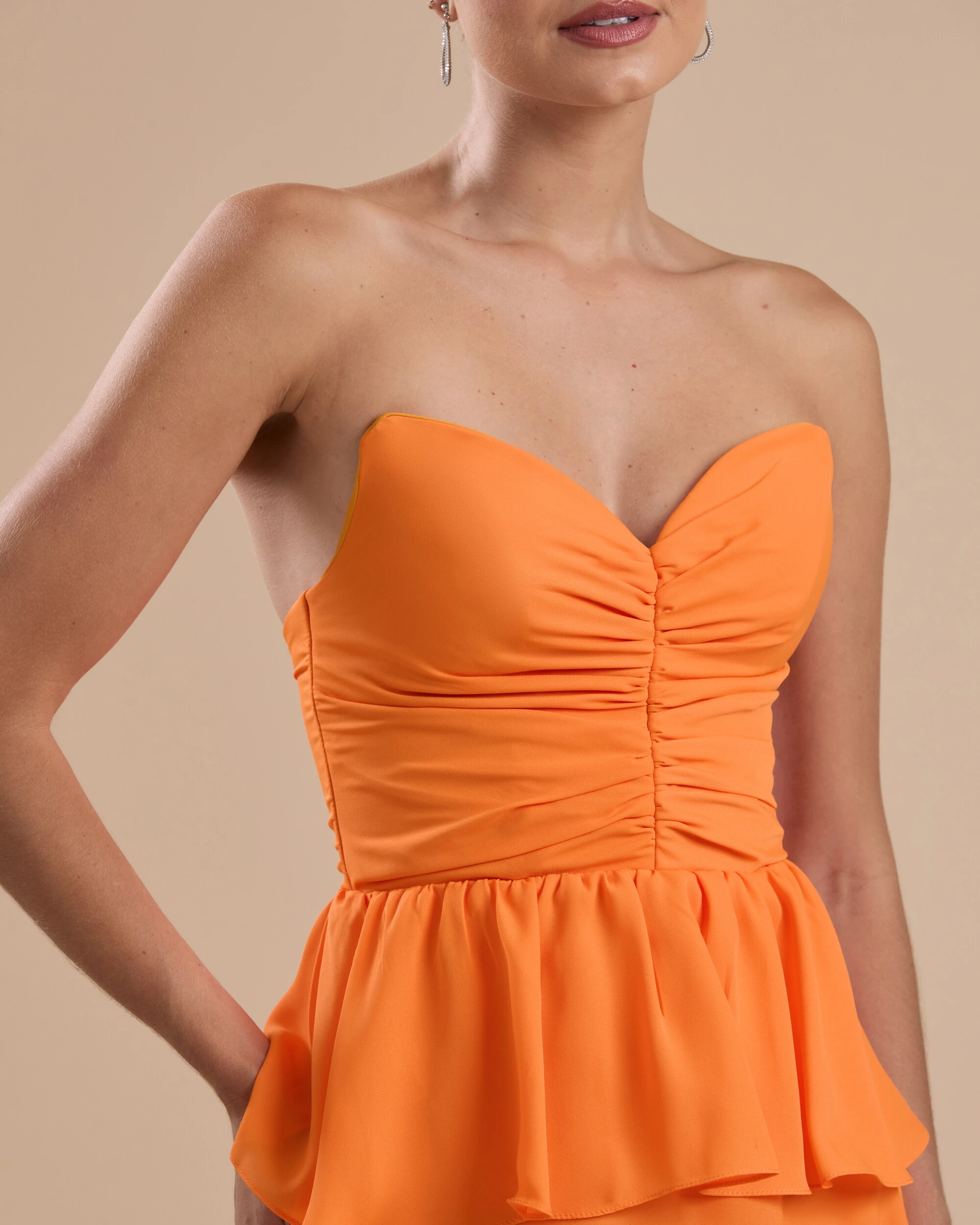 Vestido longo confeccionado em crepe chiffon, com caimento leve e fluido que traz movimento à peça. Possui busto tomara que caia com drapeado frontal, valorizando e estruturando o colo, além de recorte na cintura que marca a silhueta. O destaque fica por conta do babado sobreposto na região da cintura, que adiciona charme e sofisticação, enquanto a saia longa apresenta modelagem solta e esvoaçante, garantindo elegância e delicadeza ao visual.
